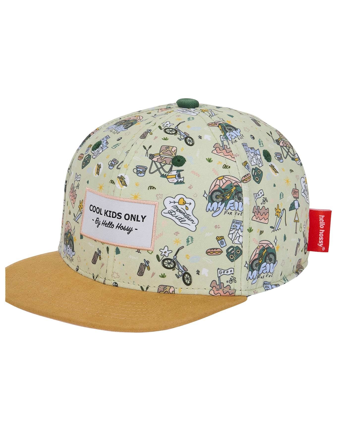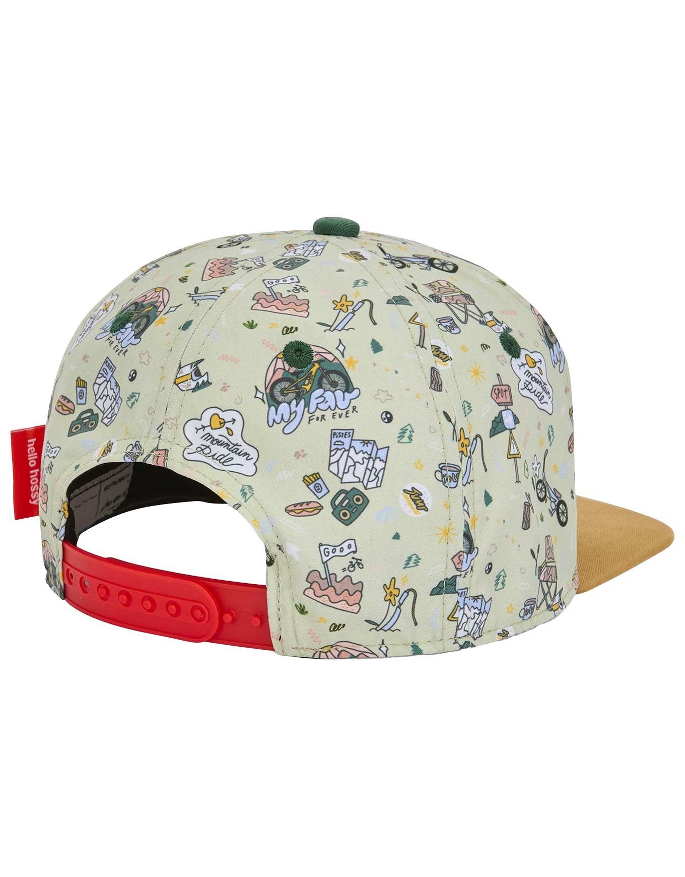 Casquette enfant Hello Hossy Mountain Ride à visière plate, look trendy et imprimé moderne, tailles réglables pour un confort tout au long de l’année.