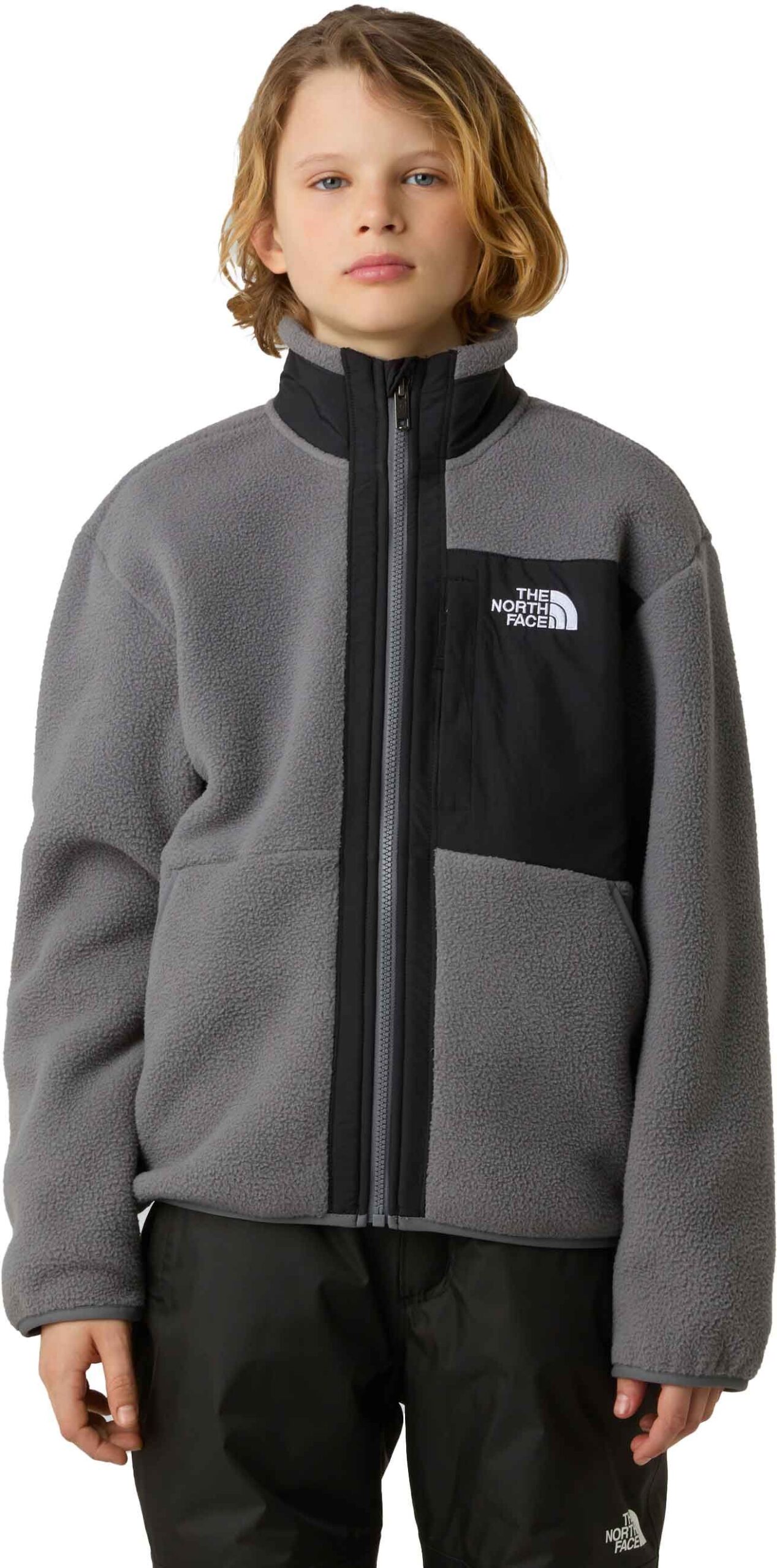 The North Face B Yumiori Full Zip polaire garçon en micropolaire recyclée offre chaleur légère, respirabilité active, col montant et trois poches zippées pour la ville ou les sentiers.