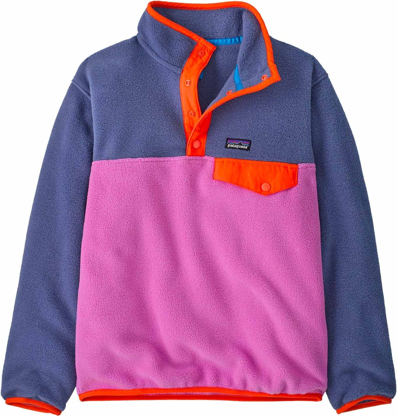 La polaire à capuche LW Synch Snap-T P/O Brisk Purple Patagonia enfant, en polaire recyclée, offre chaleur et col montant boutonné pour les sorties froides.