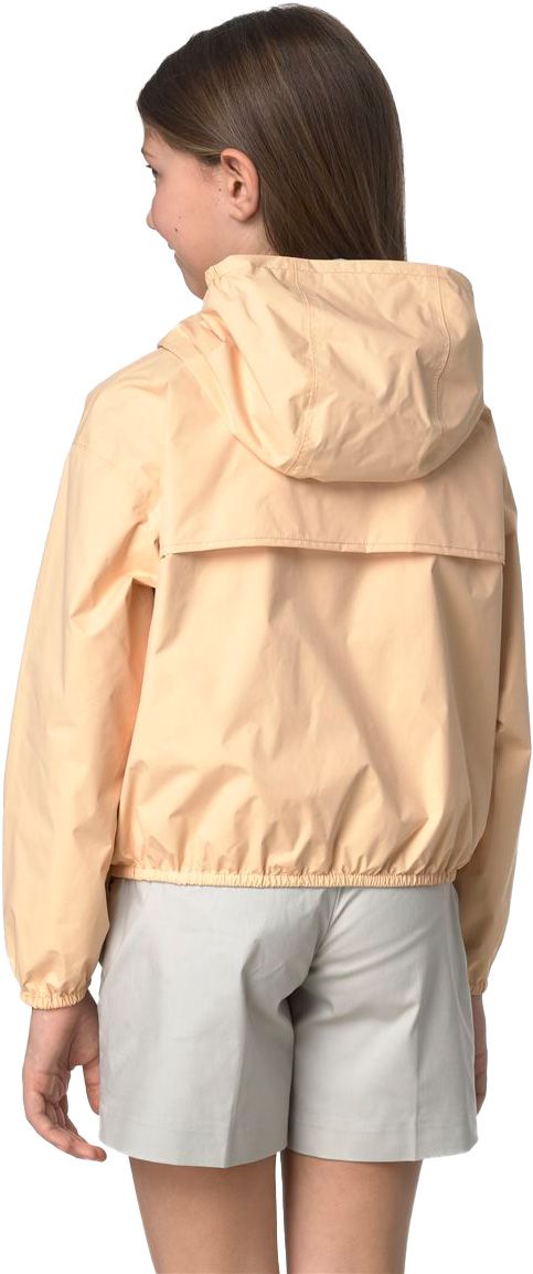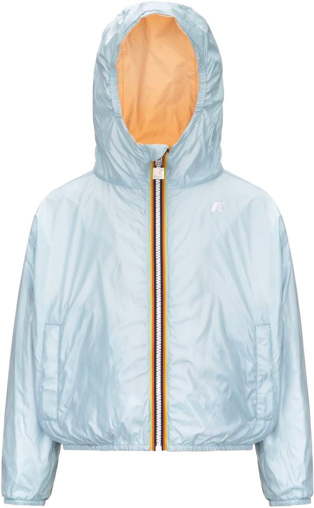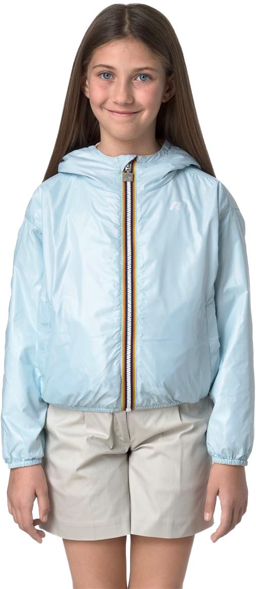 Veste réversible imperméable K-Way P. Laurette Plus.2 Double Beige Sheepskin Blue Baby pour fille, coupe-vent, respirante, capuche et poignets élastiqués, se plie compacte.