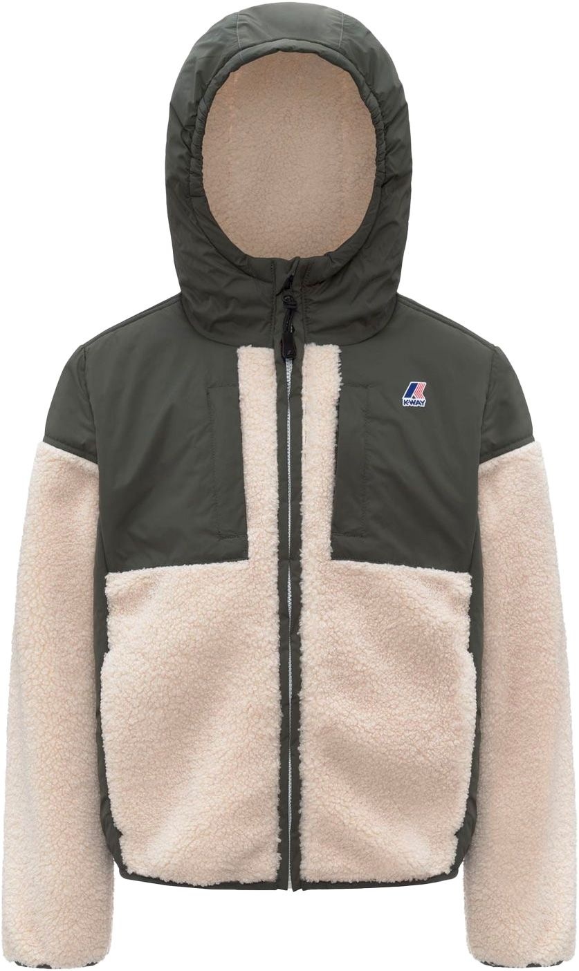 Veste bi-matière K-Way P.Samson 4.0 Orsetto Green Blackish enfant, imperméable et coupe-vent sur capuche, poitrine et côtés, douce chaleur orsetto, poches zippées, poignets élastiqués.