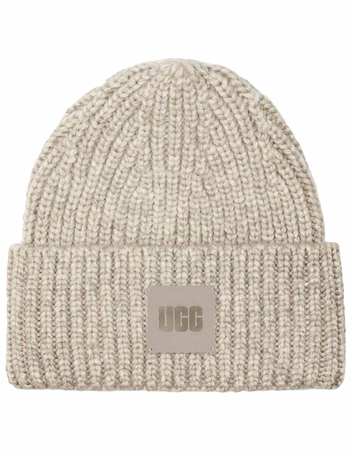 Le bonnet UGG Chunky Rib Beanie Light Grey pour femme allie maille côtelée épaisse, laine RWS et empiècement cuir signature pour un style décontracté au chaud reconnaissable.