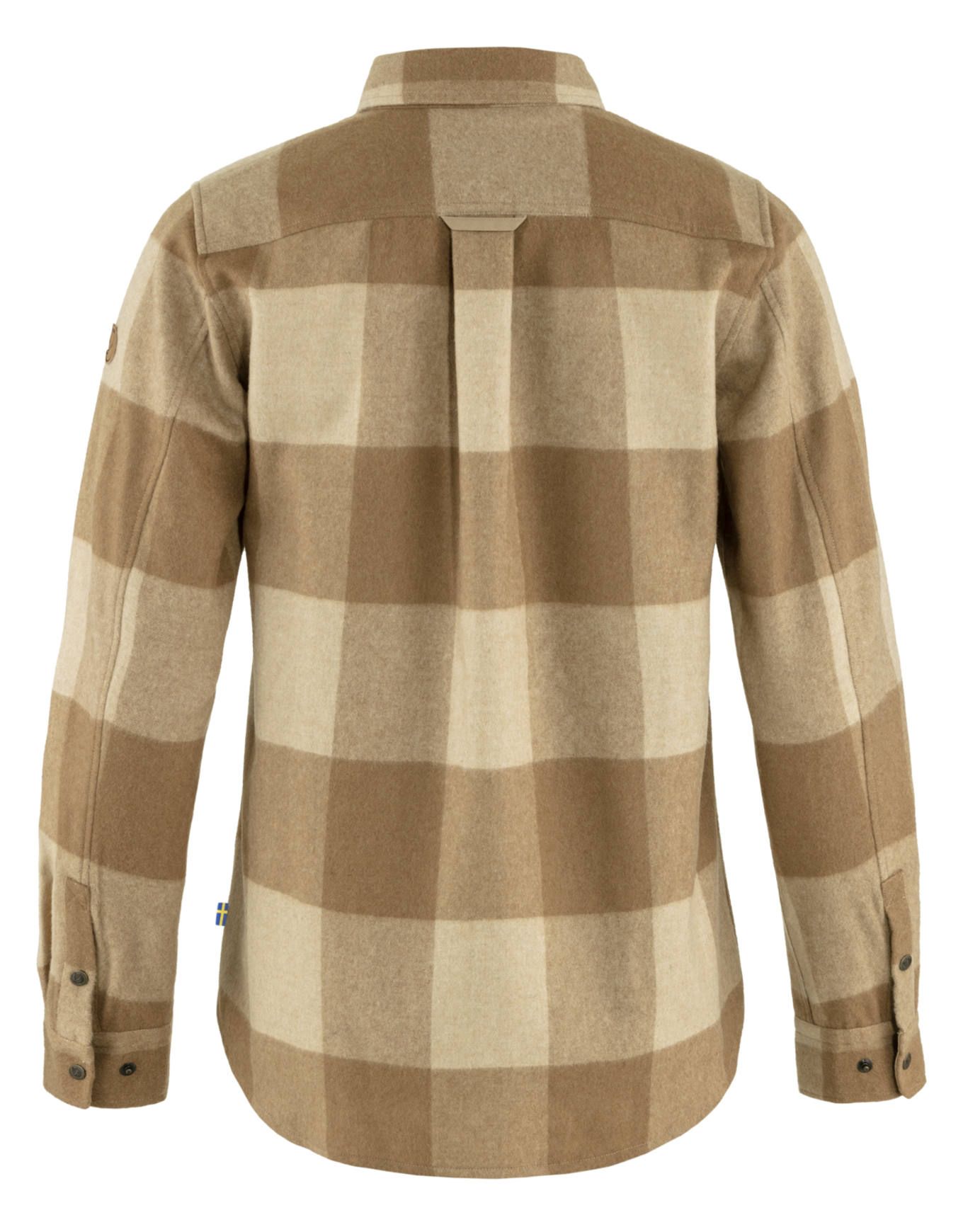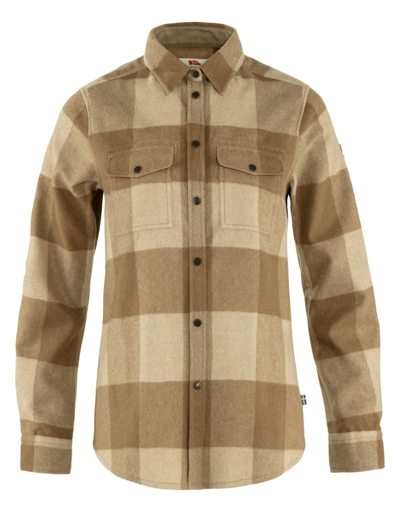 Chemise femme Fjällräven Canada Buckwheat Brown Light Beige, manches longues en tissu doux et chaud, coupe ajustée, port possible en veste légère ou couche intermédiaire.