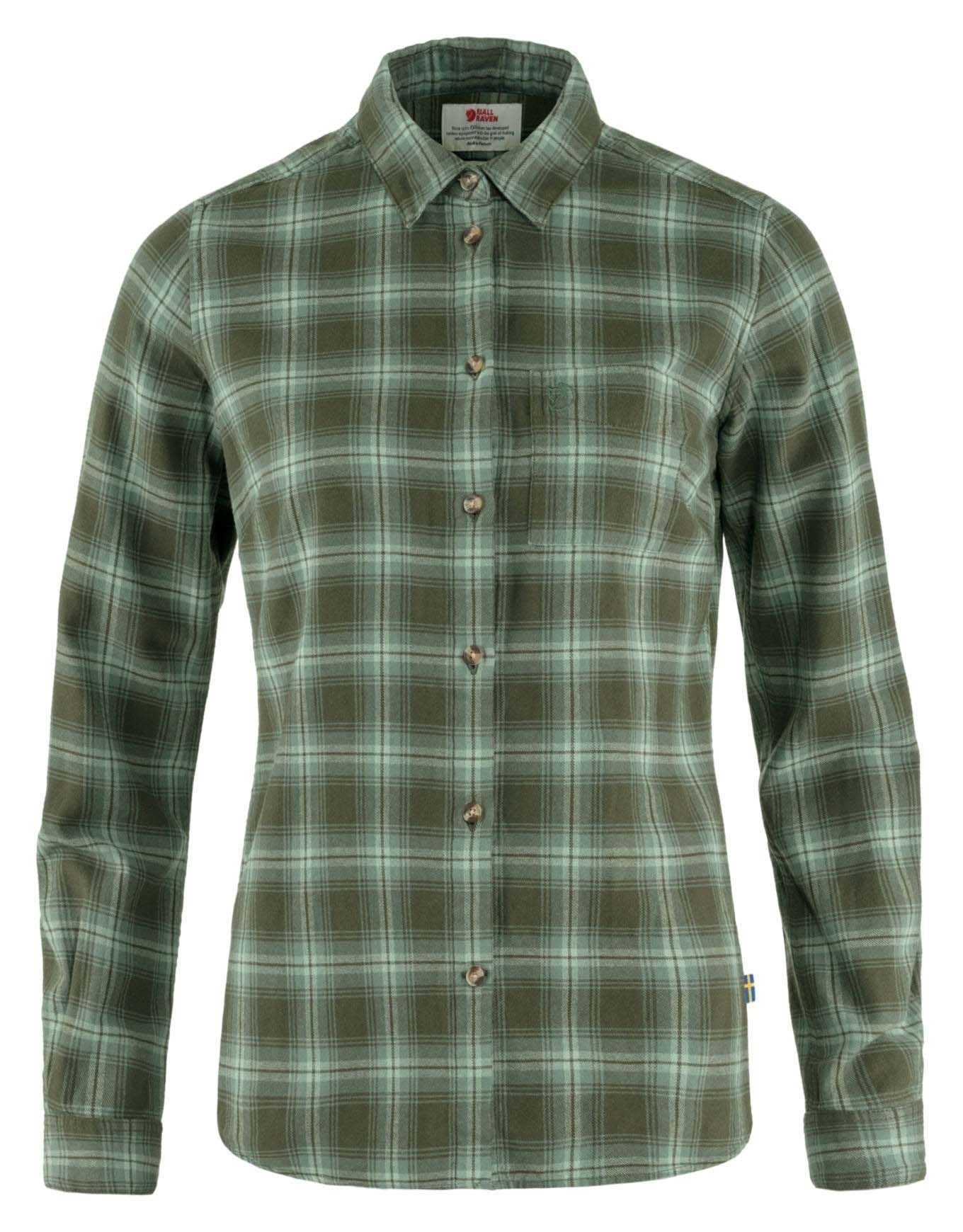 Chemise à manches longues Fjällräven Övik Flannel Deep Forest-Patina Green en coton organique doux, légère et coupe classique avec poche poitrine et boutons en polyester recyclé, idéale pour les après-midis plein air.