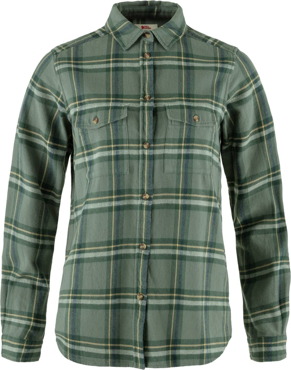 Chemise Fjällräven Övik Heavy Flannel Patina Green Deep Patina femme en flanelle de coton bio, col boutonné, deux poches poitrine, coupe ample pour couches techniques et liberté de mouvement.