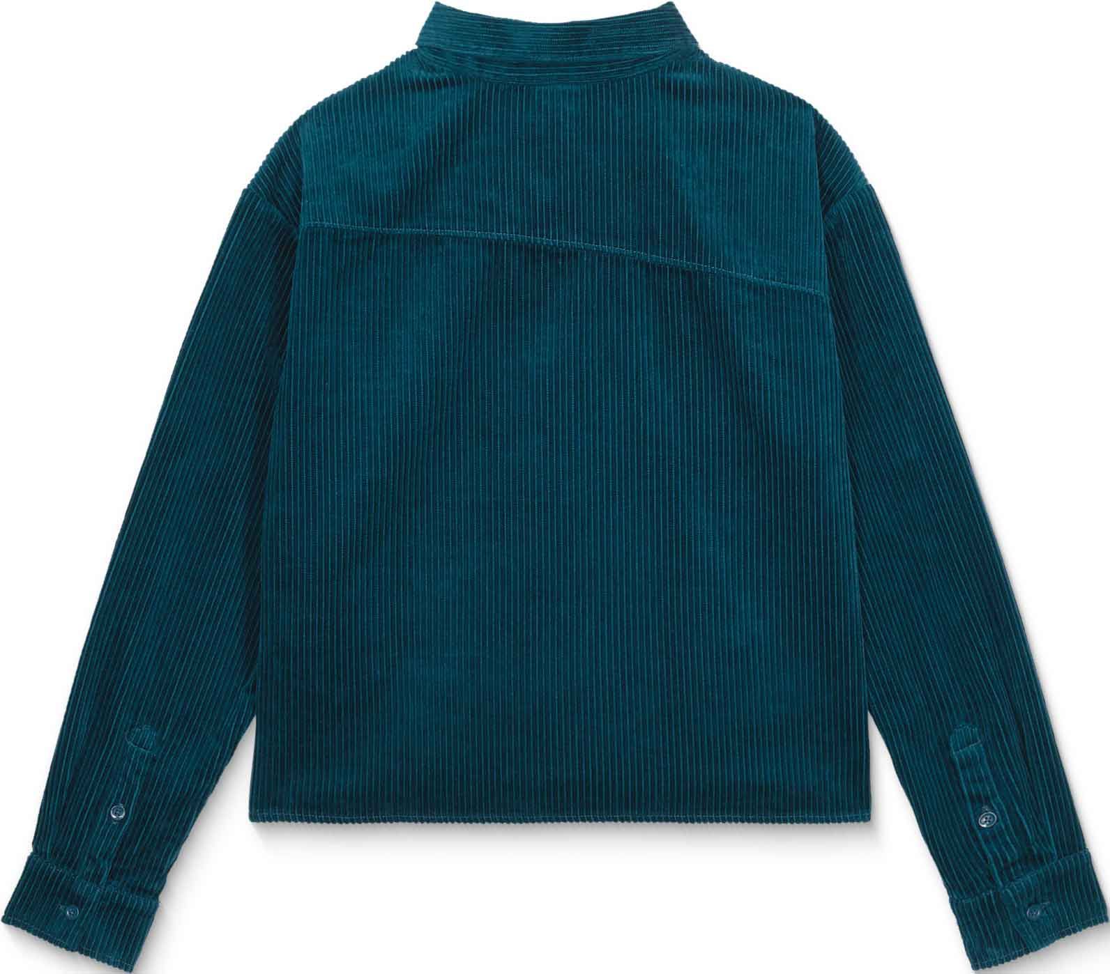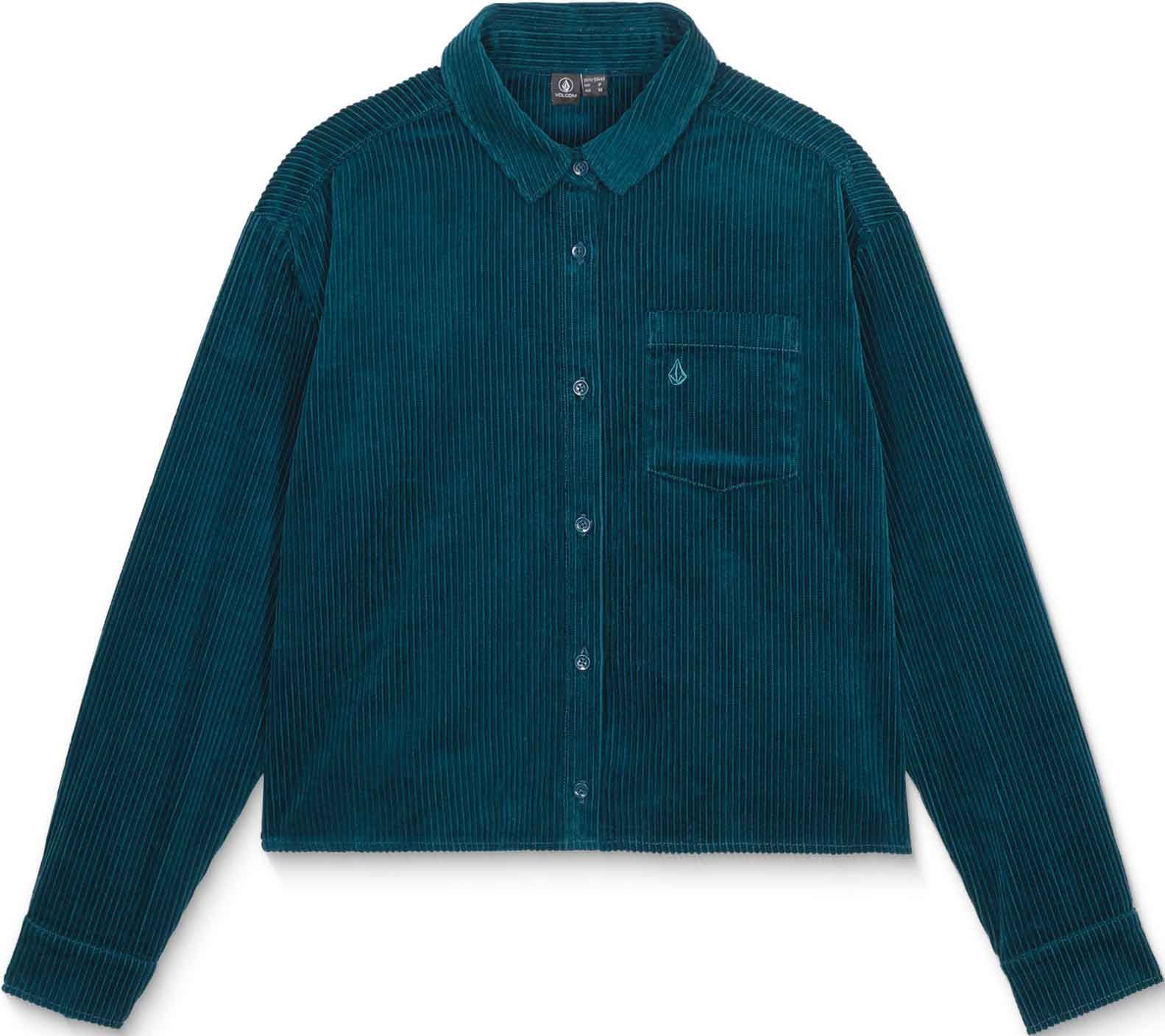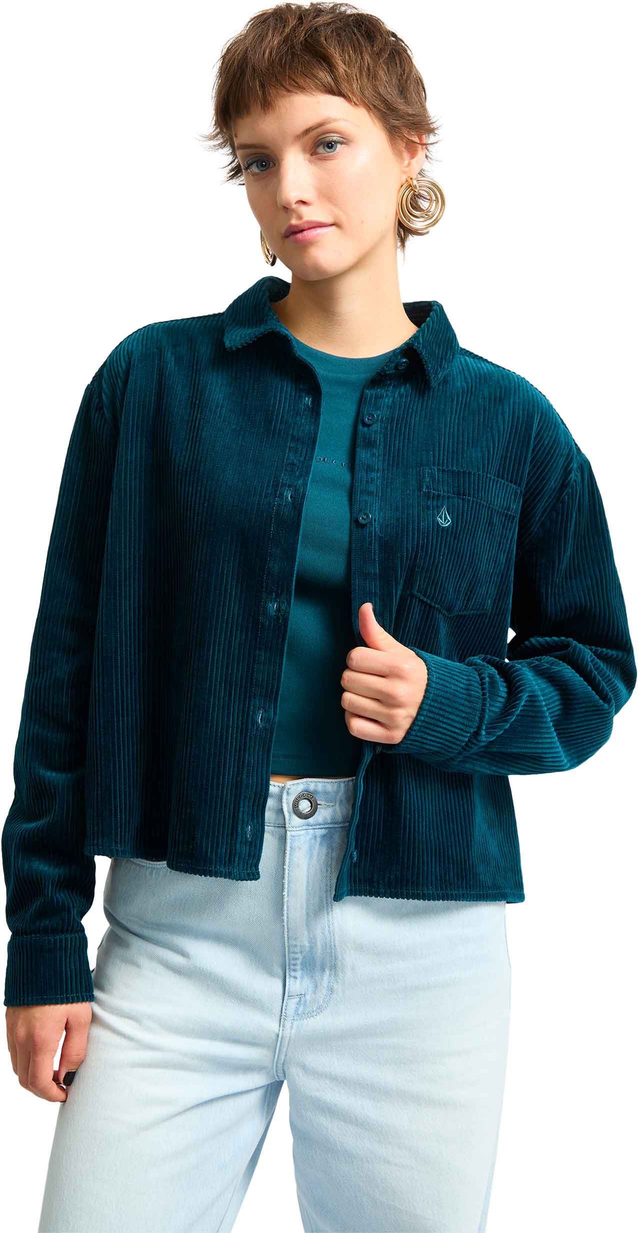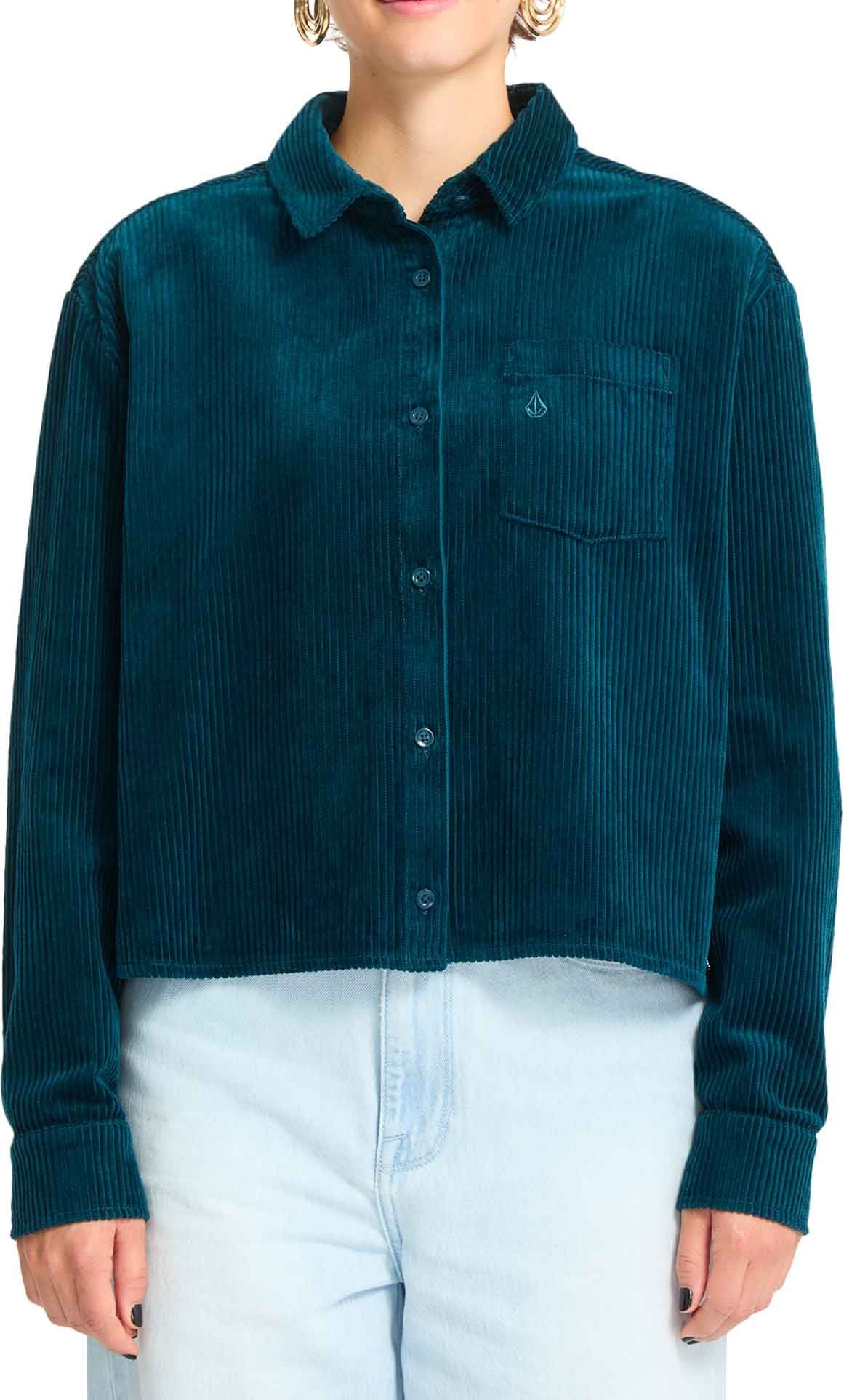 Chemise Volcom Weellow Cord Emerald Green pour femme en velours côtelé 100 % coton, coupe carrée structurée, col chemise, manches longues, broderie poitrine et empiècement dos diagonal.