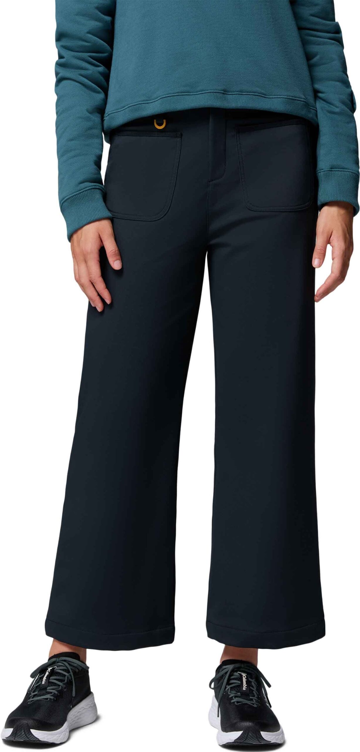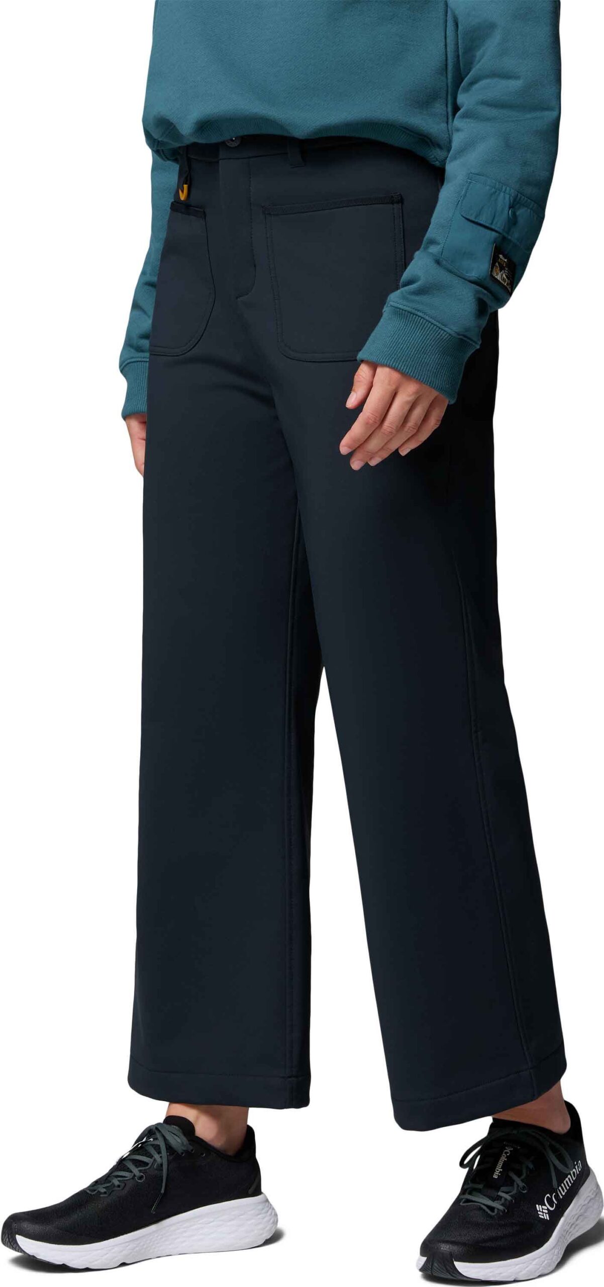 Pantalon Columbia High Cascades Wide Leg Softshell femme à coupe évasée, résistant aux éclaboussures, avec poches mains et arrière rabat, ceinture réglable.