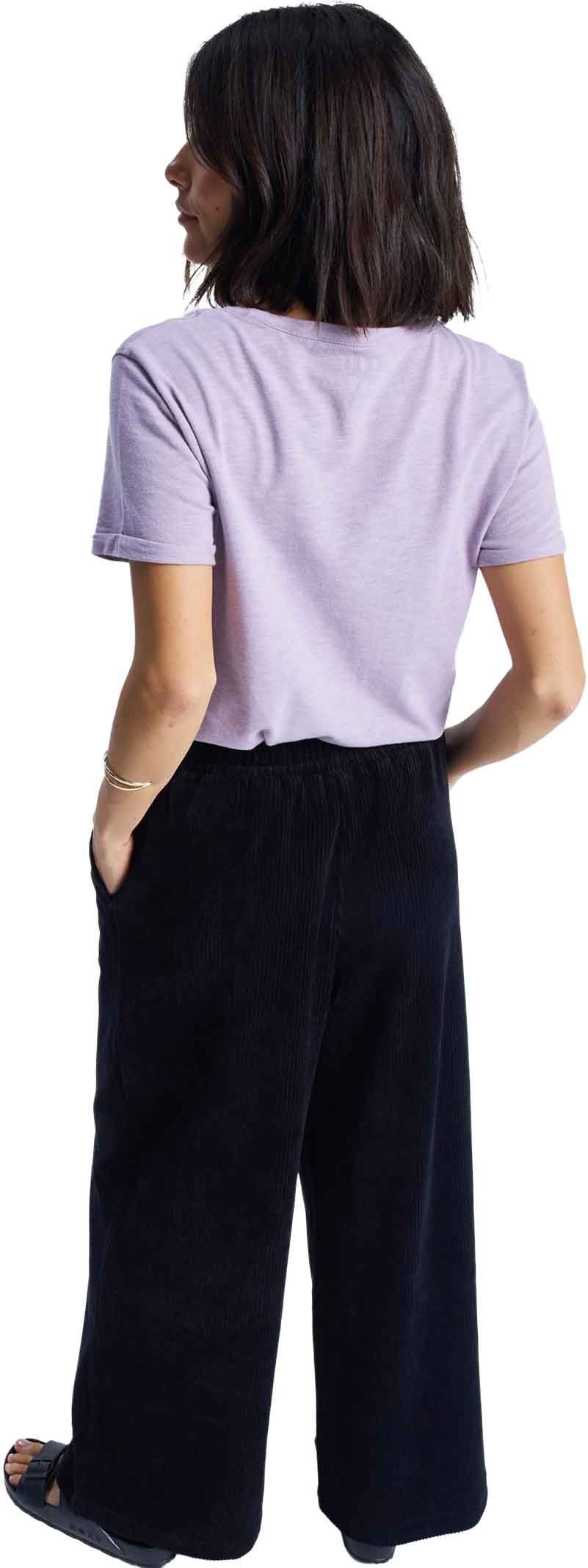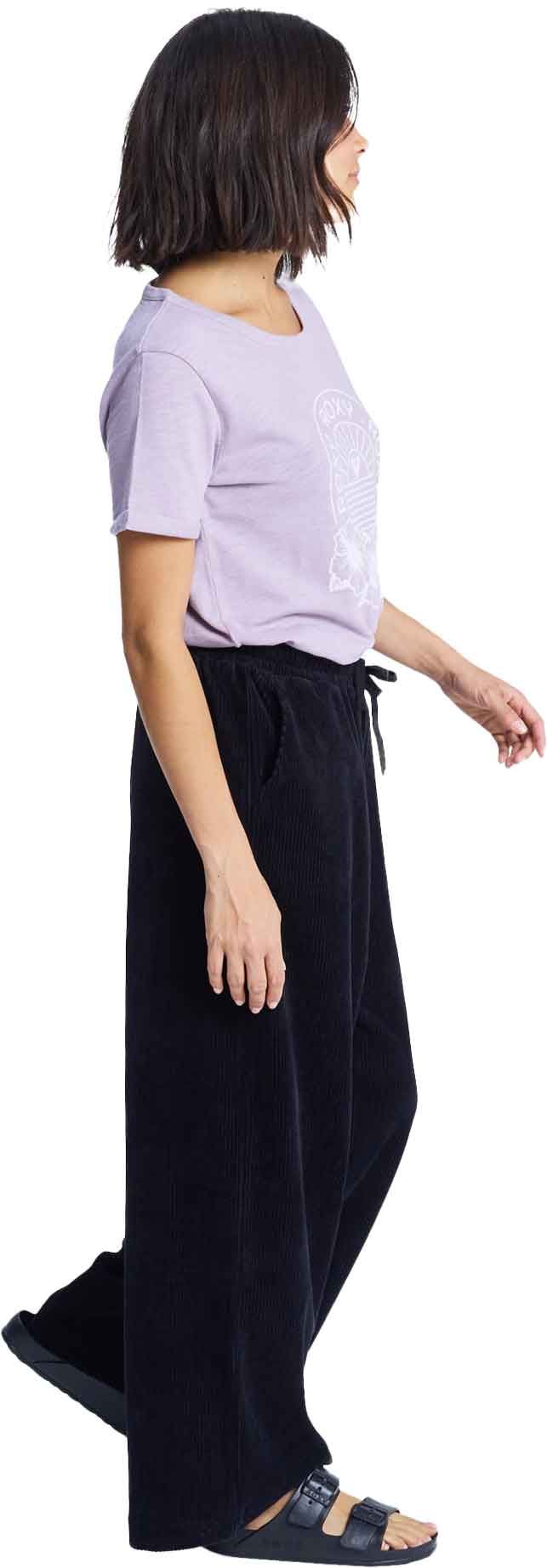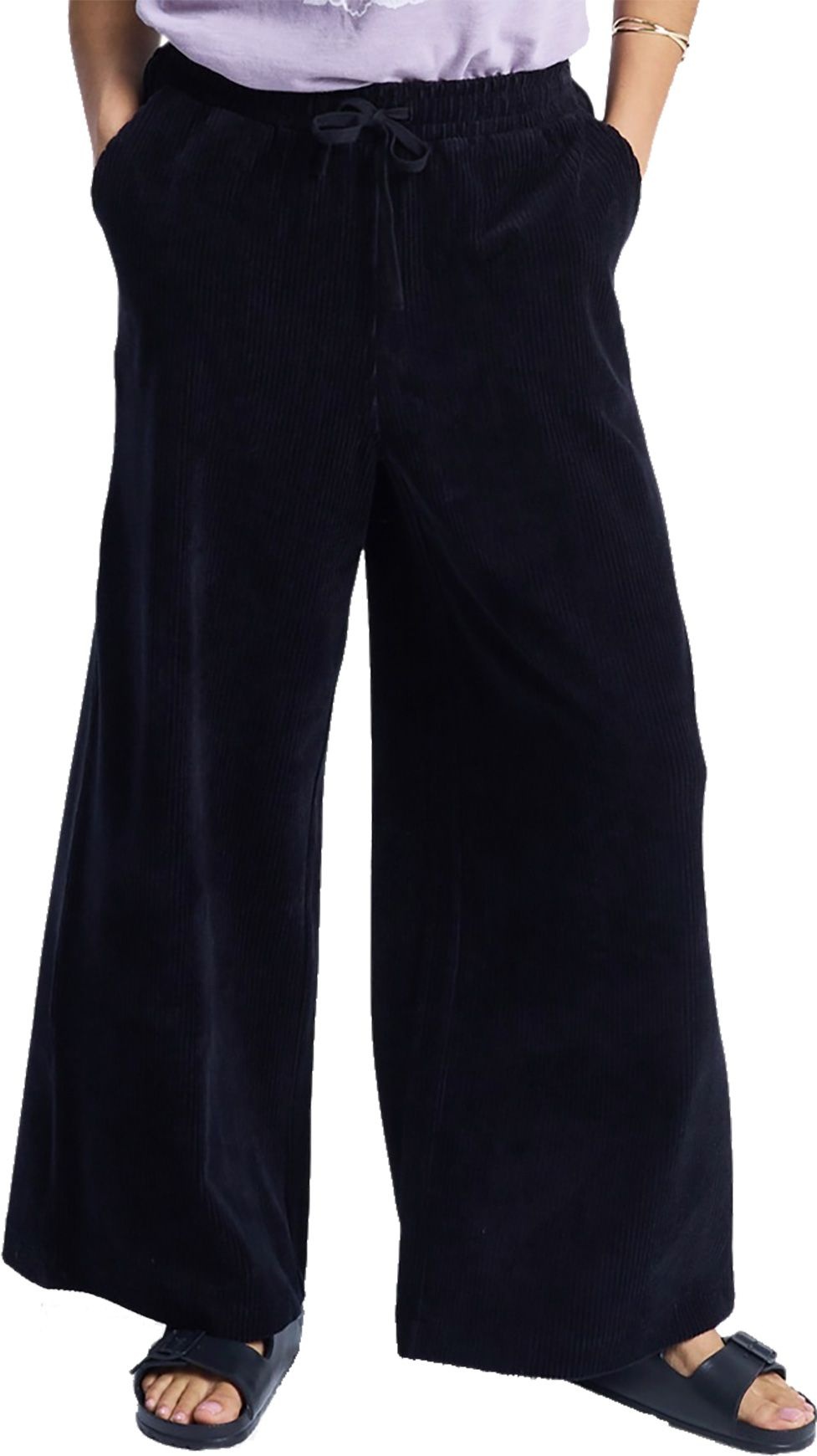 Le pantalon Roxy Lektitio Pant Knit True Black pour femme allie confort et style rétro en velours côtelé extensible, avec taille haute ajustable et jambes larges.
