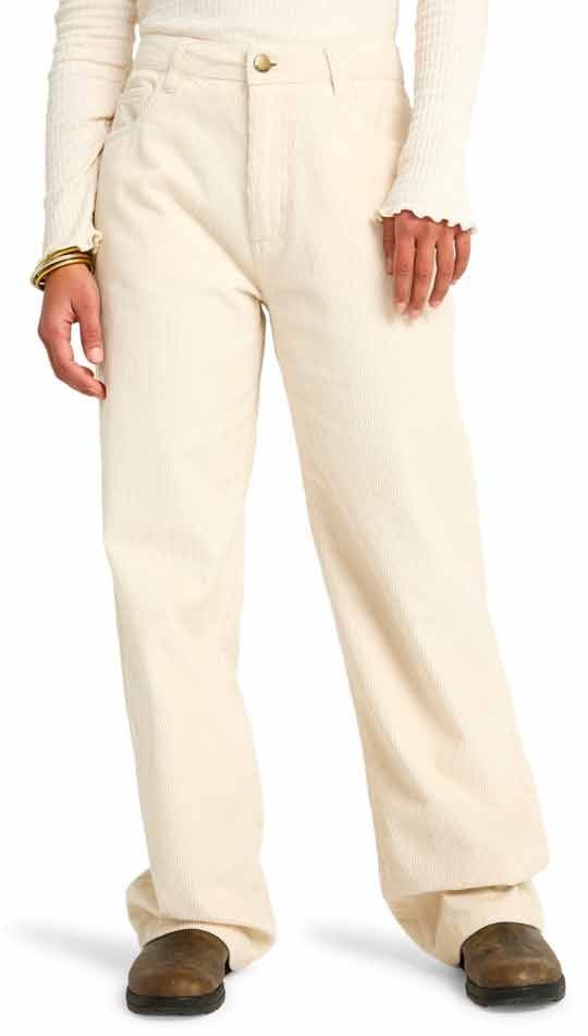 Billabong Midtown Cord Pant White Cap : pantalon femme en velours côtelé 100 % coton, taille mi-haute et jambe droite pour un confort décontracté et une silhouette équilibrée.