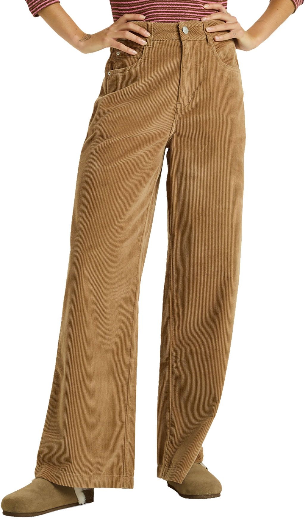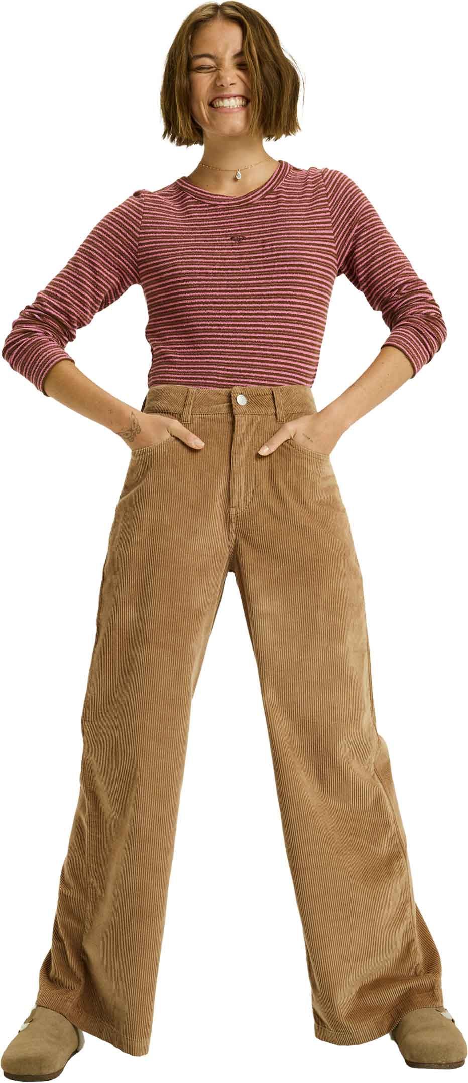 Pantalon Roxy Surf On Cloud Cord Pant Woodsmoke pour femme, en velours côtelé extensible coton élasthanne, coupe jambe large taille haute.