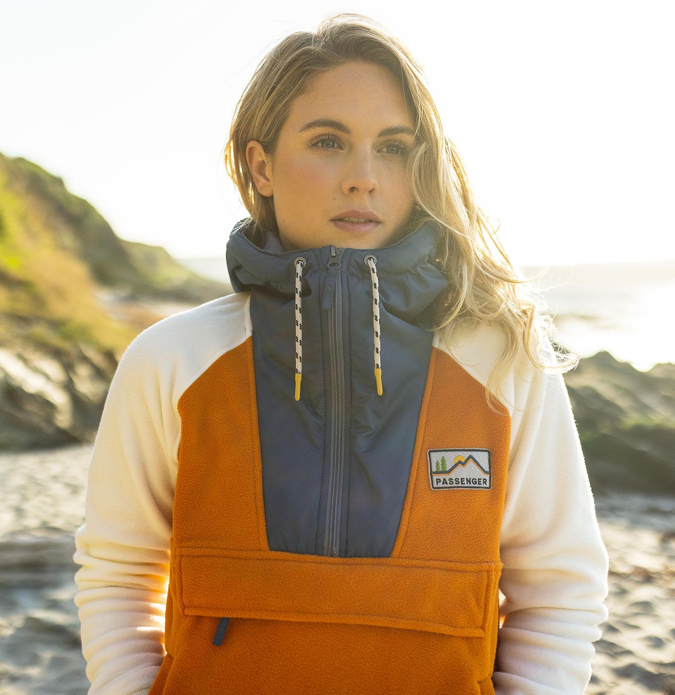 Passenger Clothing Alexander Recycled Polar Hooded Fleece polaire femme Sunrise Orange en polyester recyclé, chaude, légère, avec capuche réglable et poche kangourou pour escapades outdoor et soirées van.