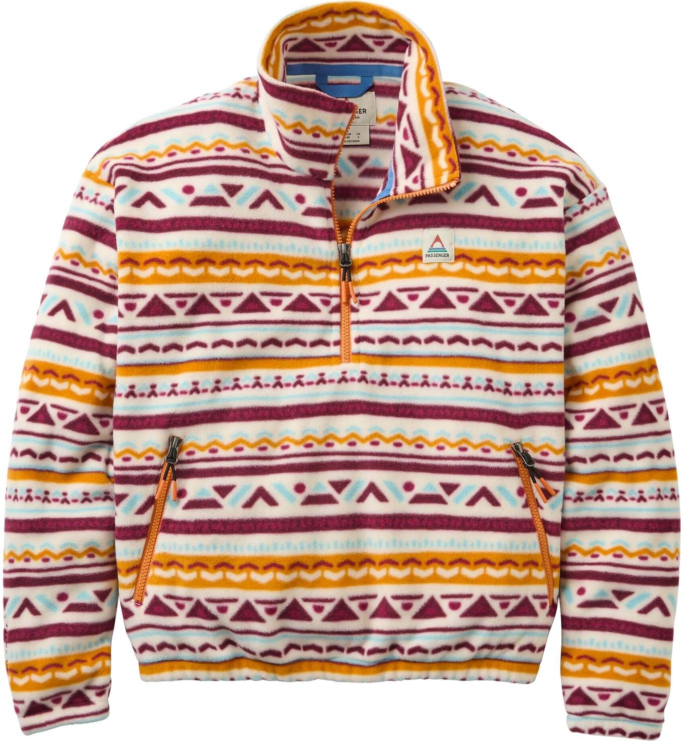 La polaire Ayla Recycled Polar Fleece Geo Tracks Birch de Passenger Clothing, en micropolaire Polartec® 100 % polyester recyclé, offre chaleur légère et liberté de mouvement pour la randonnée ou la van life.
