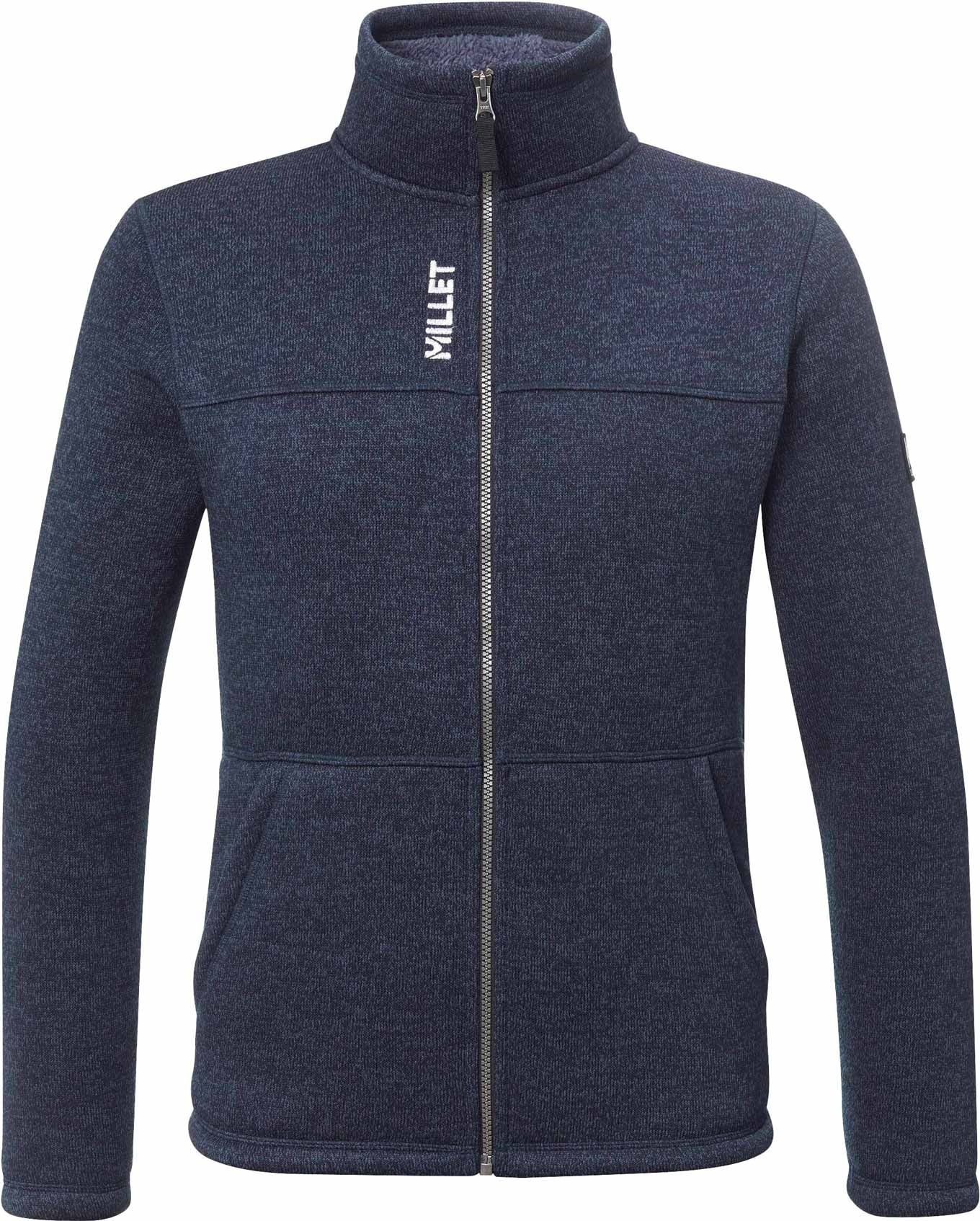 Millet Chamonix Knitwarm W Navy, polaire technique homme en polaire molletonnée isolante, col protecteur, zip frontal et deux poches repose-mains pour l’escalade et le quotidien.