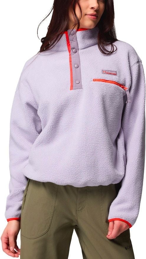 Columbia Helvetia II Cropped Half Snap Fleece : polaire femme en sherpa doux, coupe courte, col montant demi-pressionné, poche poitrine zippée et ourlet ajustable pour chaleur et style au quotidien.