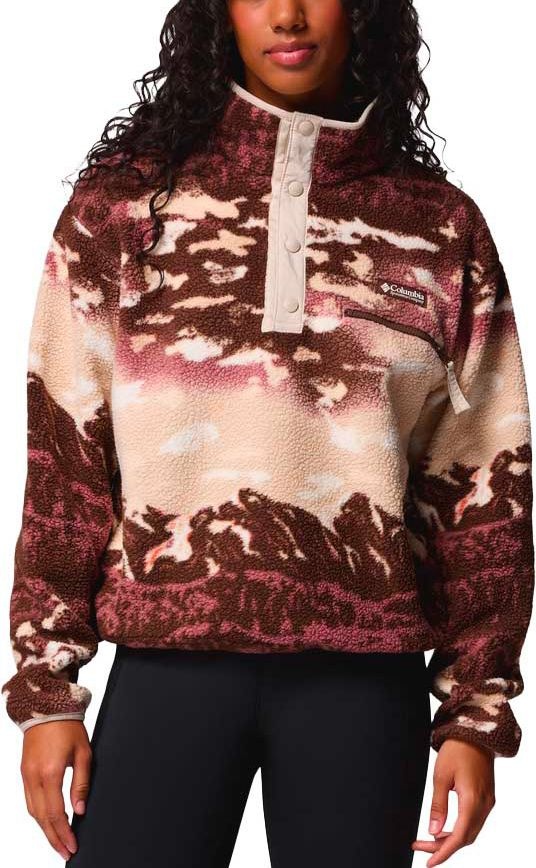 Polaire Columbia Helvetia II Printed Cropped Half Snap Tobacco Sisters Dark Stone femme en sherpa doux, chaude et stylée. Coupe courte ajustable, poche poitrine zippée, col demi-pressionné contre le vent.