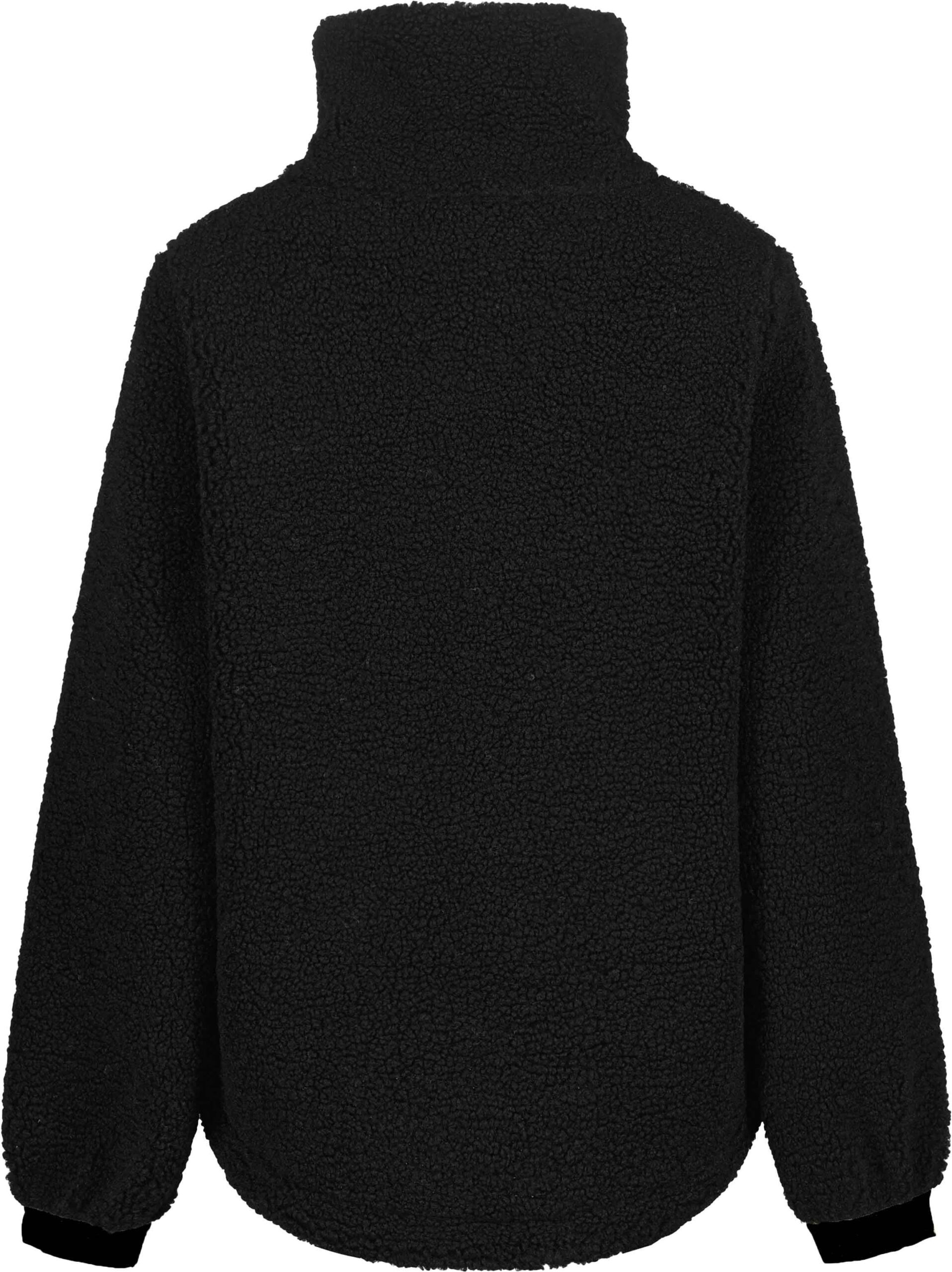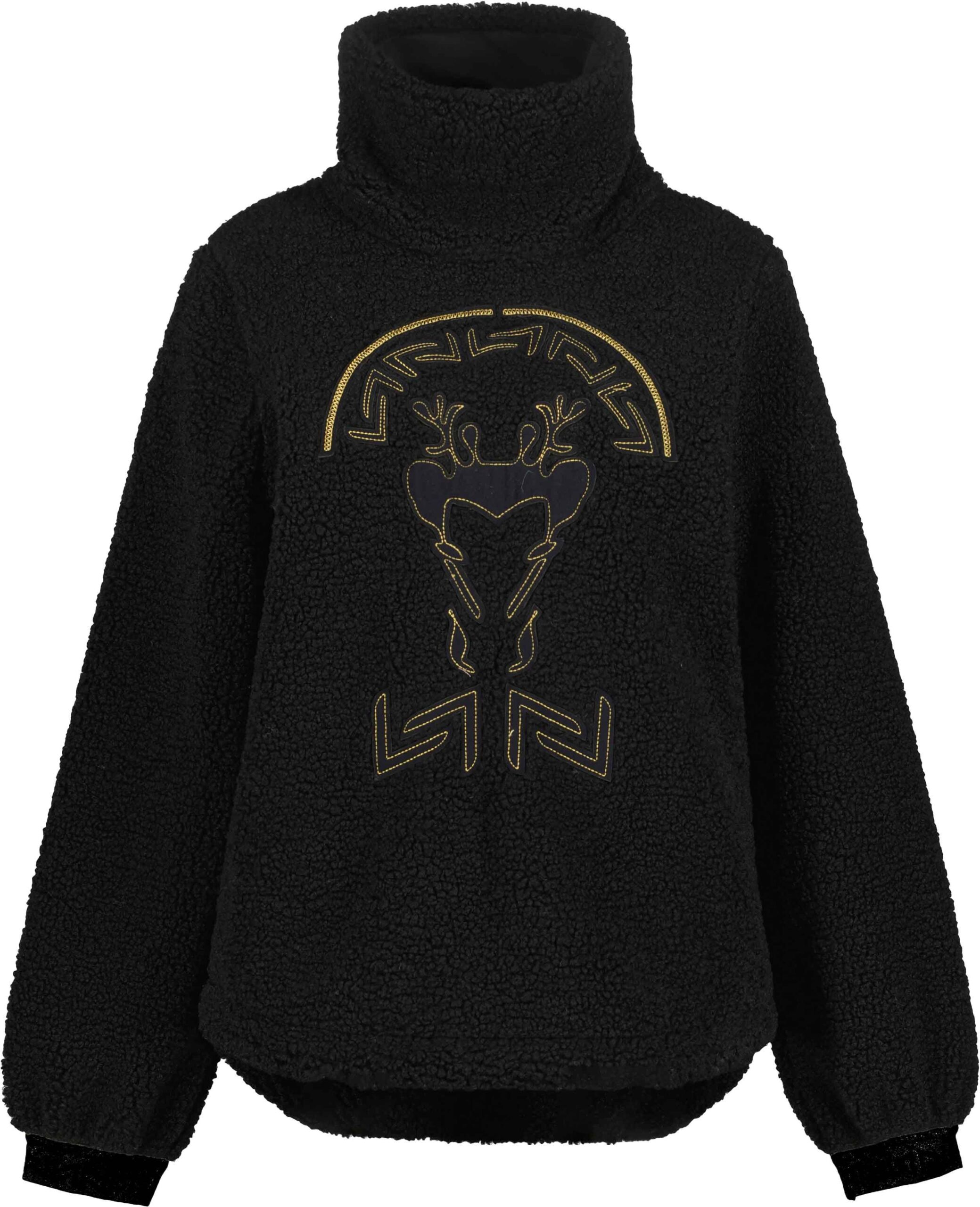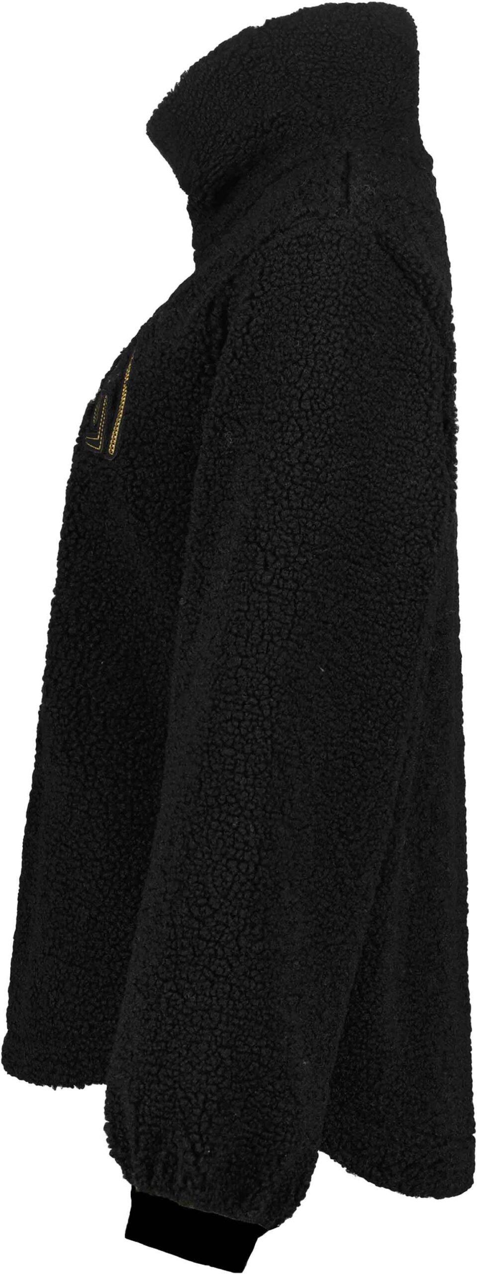 Luhta Iinatti polaire femme en sherpa noir, col montant ample, motif finlandais graphique, coupe décontractée, poignets côtes et ourlet arrière plus long pour chaleur et style hivernal.