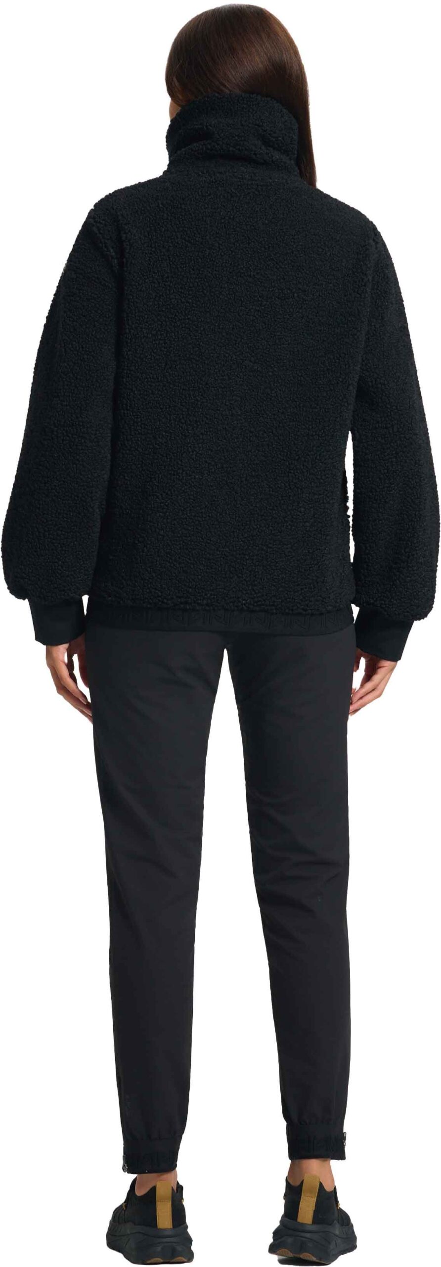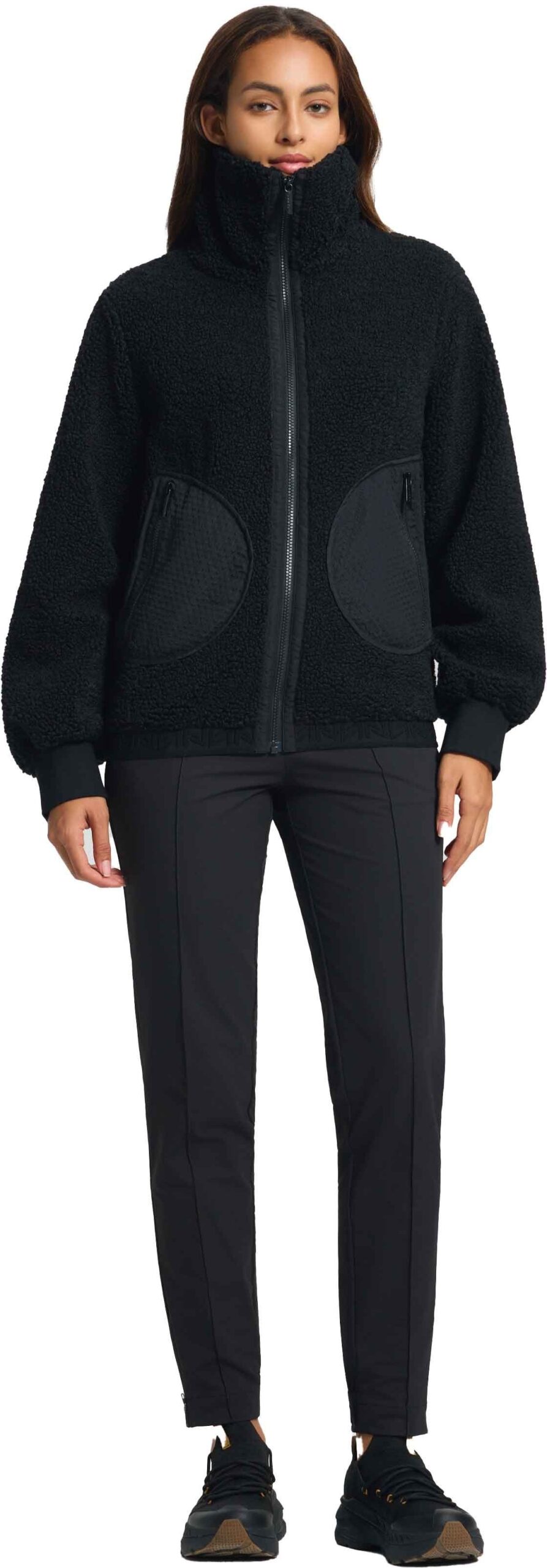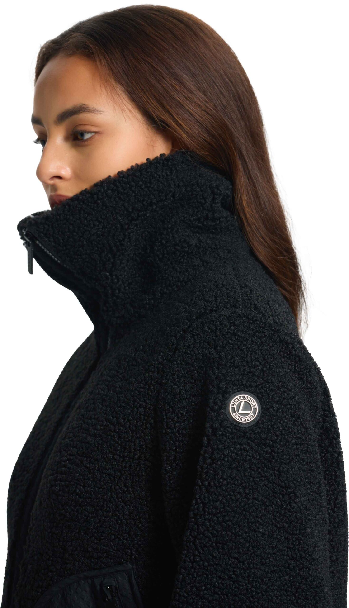 Polaire femme Luhta Iskoinen en sherpa noir : chaleur légère, coupe décontractée, col montant et poches zippées pour un confort urbain hivernal.