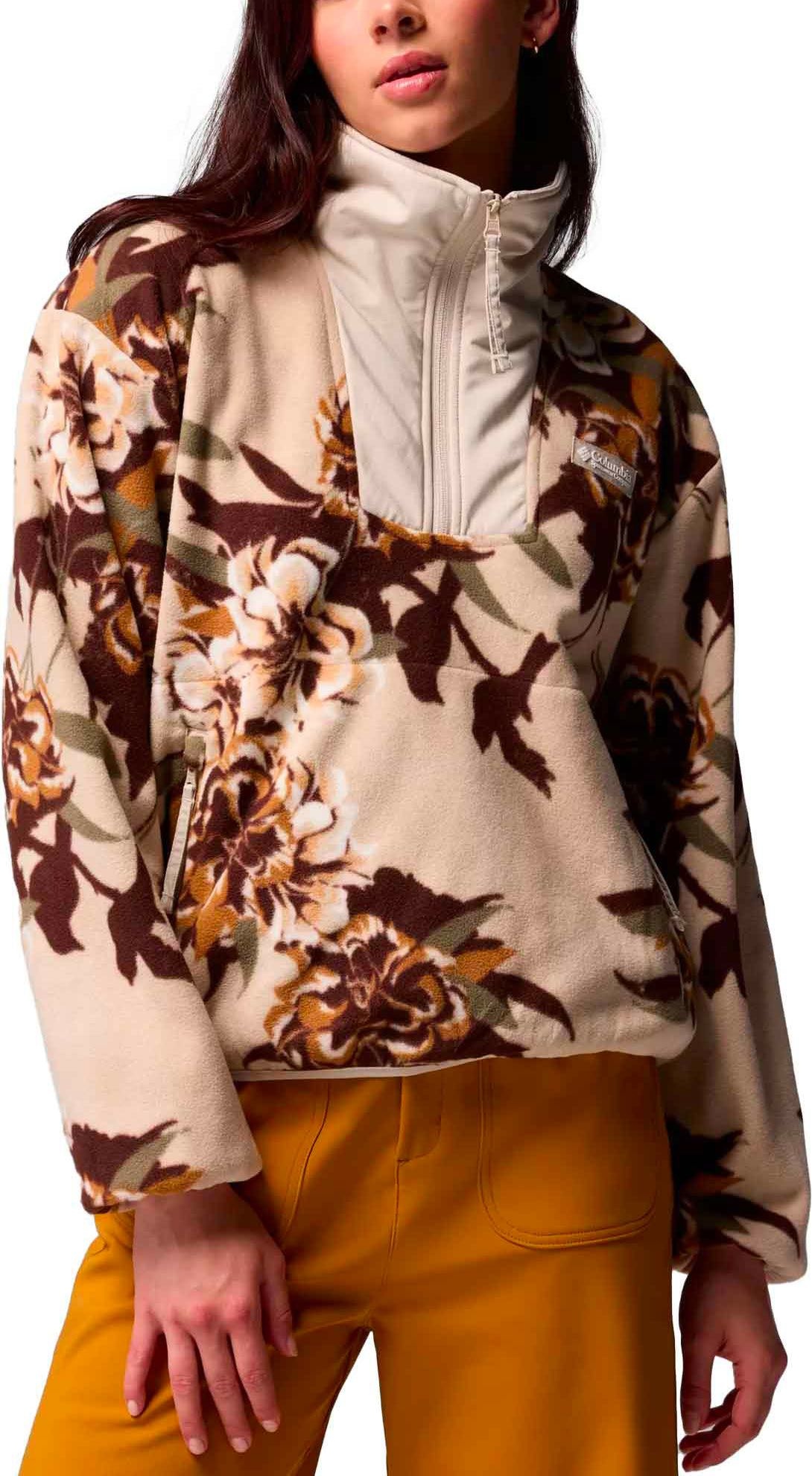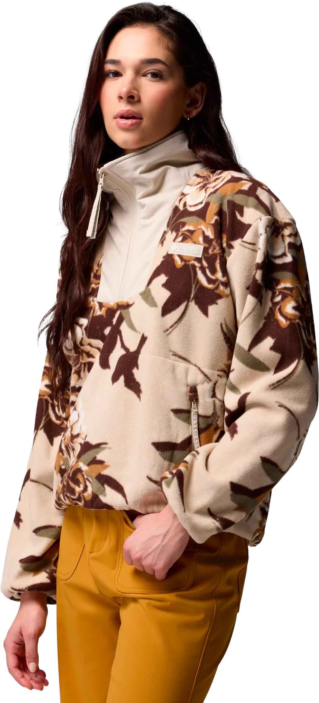 La polaire Columbia Sequoia Grove Printed Half Zip Dark Stone Blossoming pour femme allie style original et chaleur en polyester recyclé, avec col montant et poches zippées.