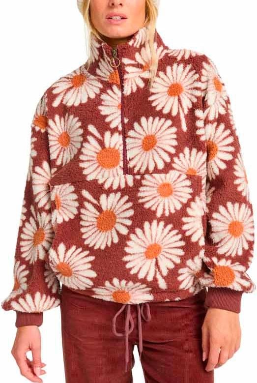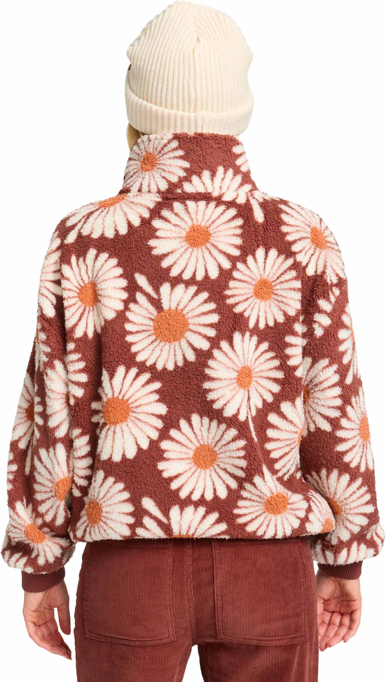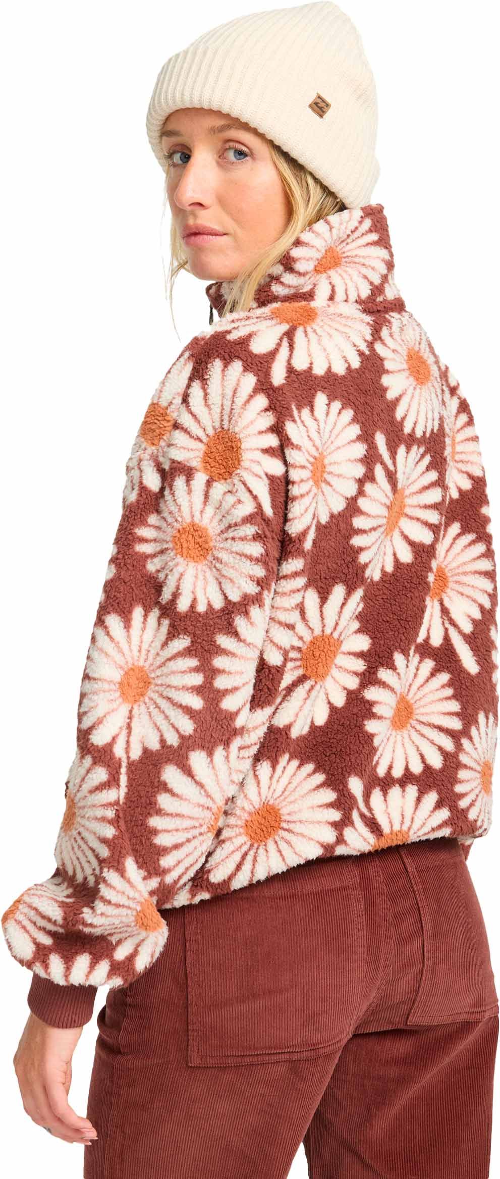 Polaire Billabong Time Off Espresso femme en polyester recyclé 100 %, doublure sherpa imprimée, demi-zippée, poches zippées, ourlet ajustable, bords côtelés aux poignets.
