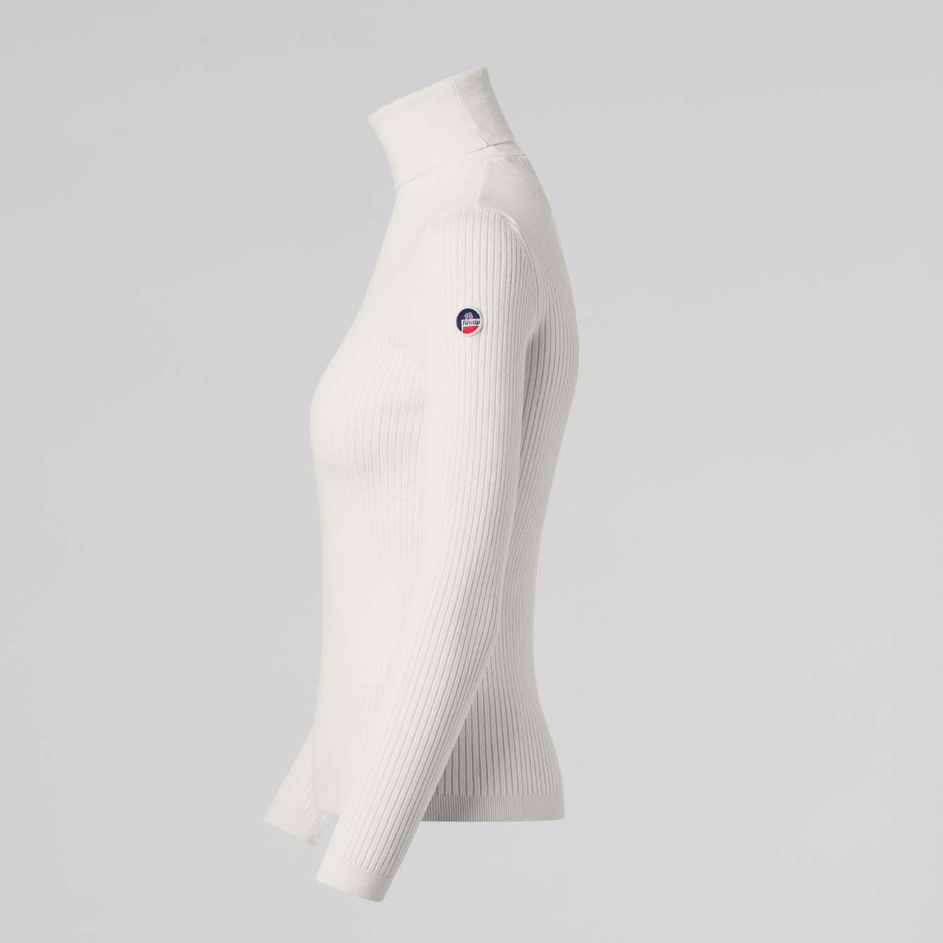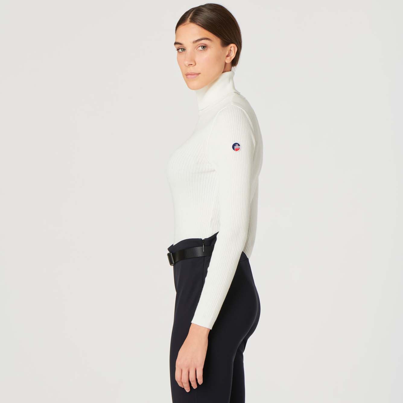 Fusalp Ancelle Poudre, pull femme en viscose EcoVero™ résistant, col montant et mailles côtelées pour chaleur et confort hivernal.