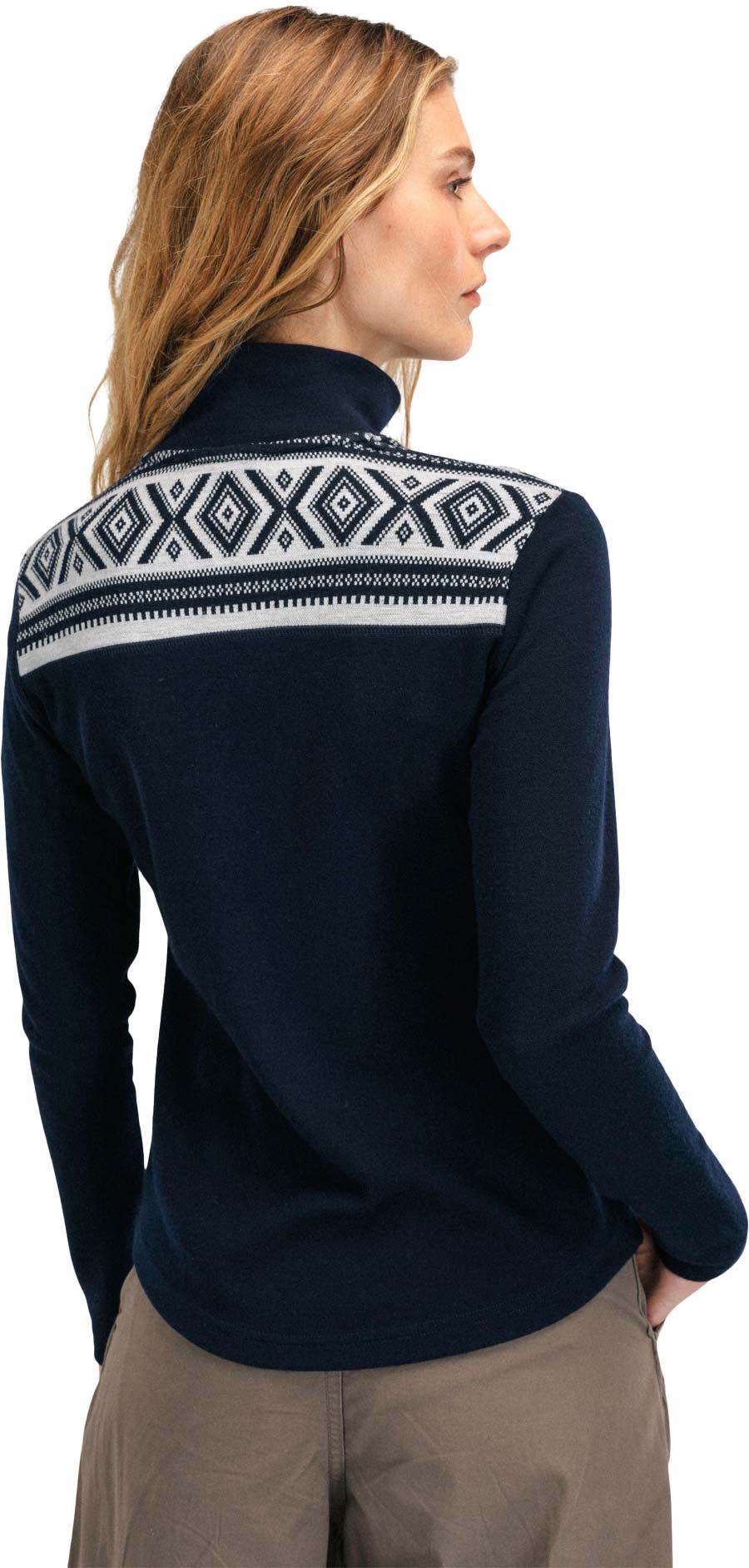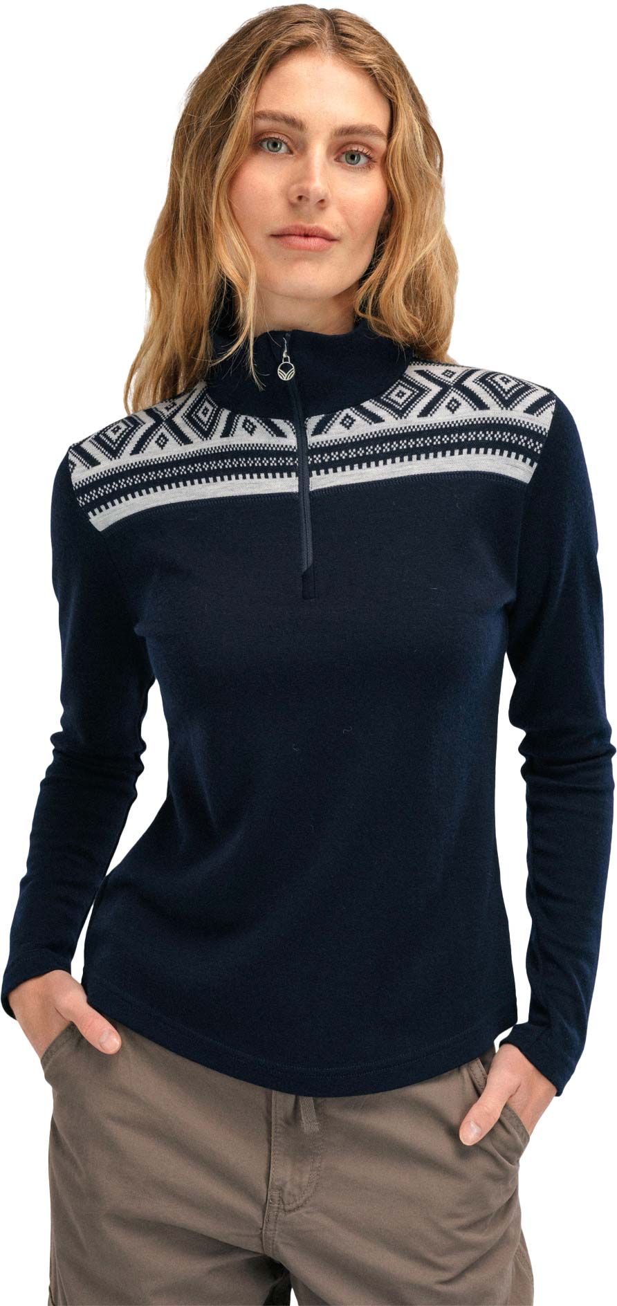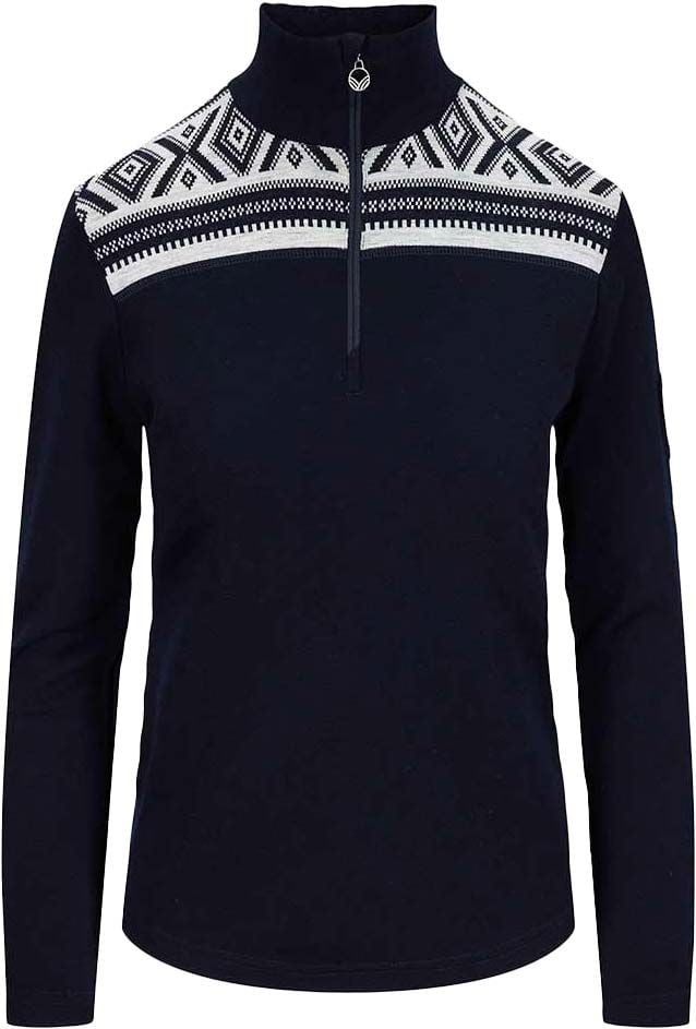 Pull Dale of Norway Cortina Basic Sweater femme en laine mérinos 100 %, isolation respirante, col montant demi-zip et motifs graphiques.