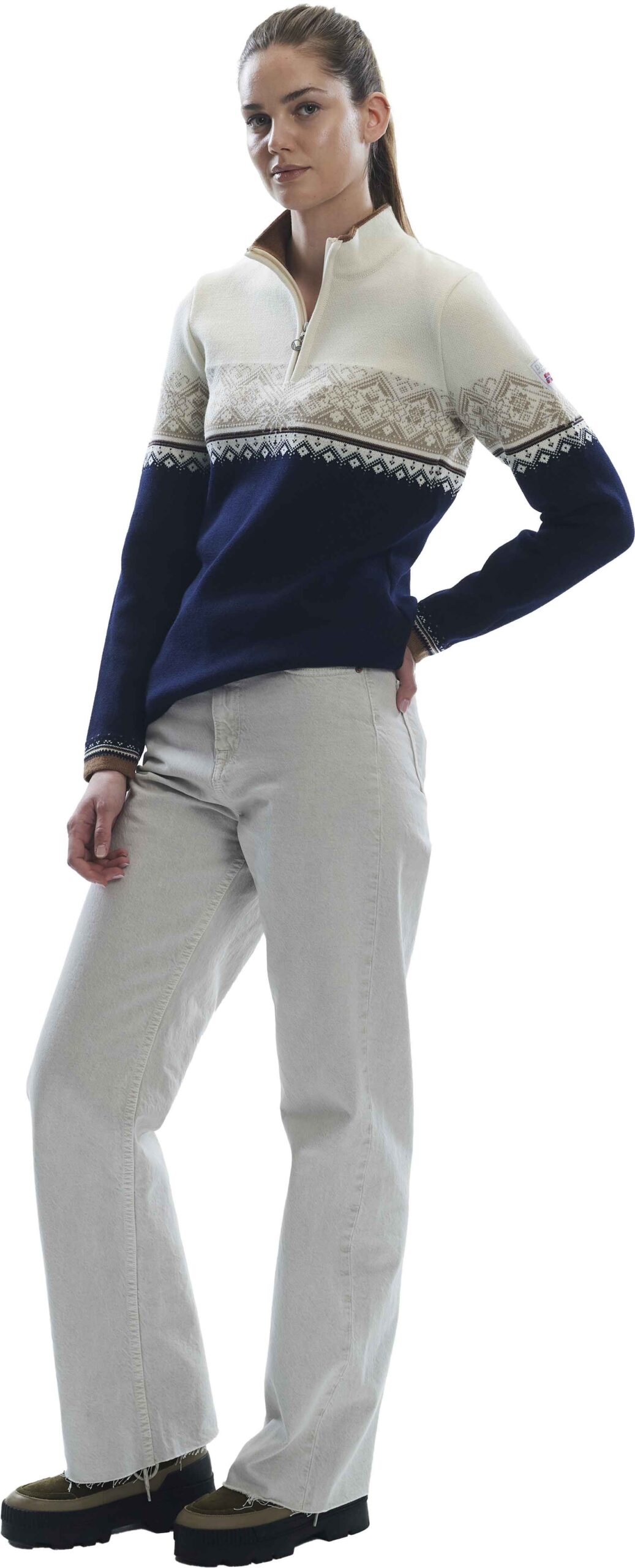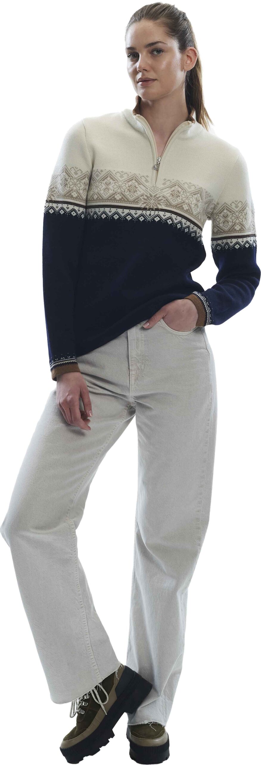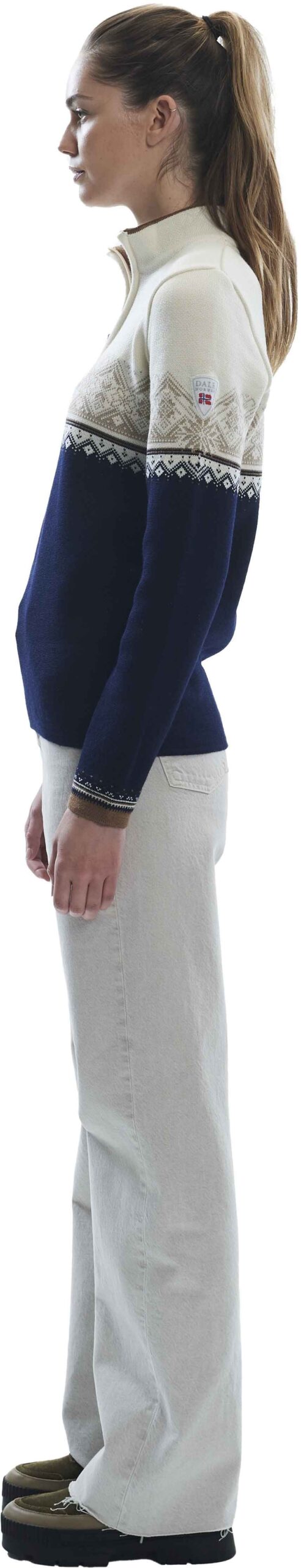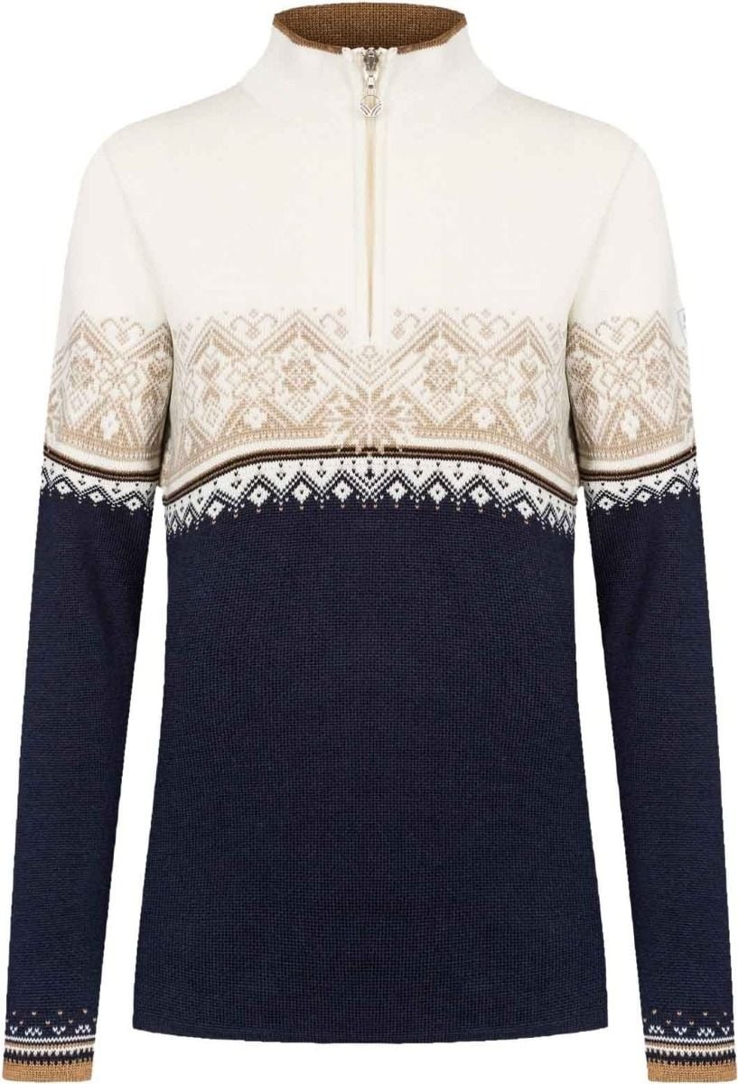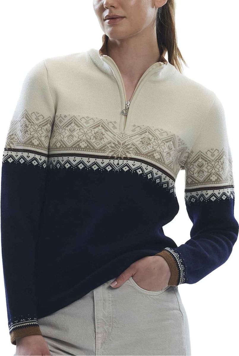 Pull Dale of Norway Moritz femme en laine mérinos 100 %, isolation respirante et col demi-zip. Motifs St. Moritz 2003, coupe sportive élégante, tricoté en Norvège.