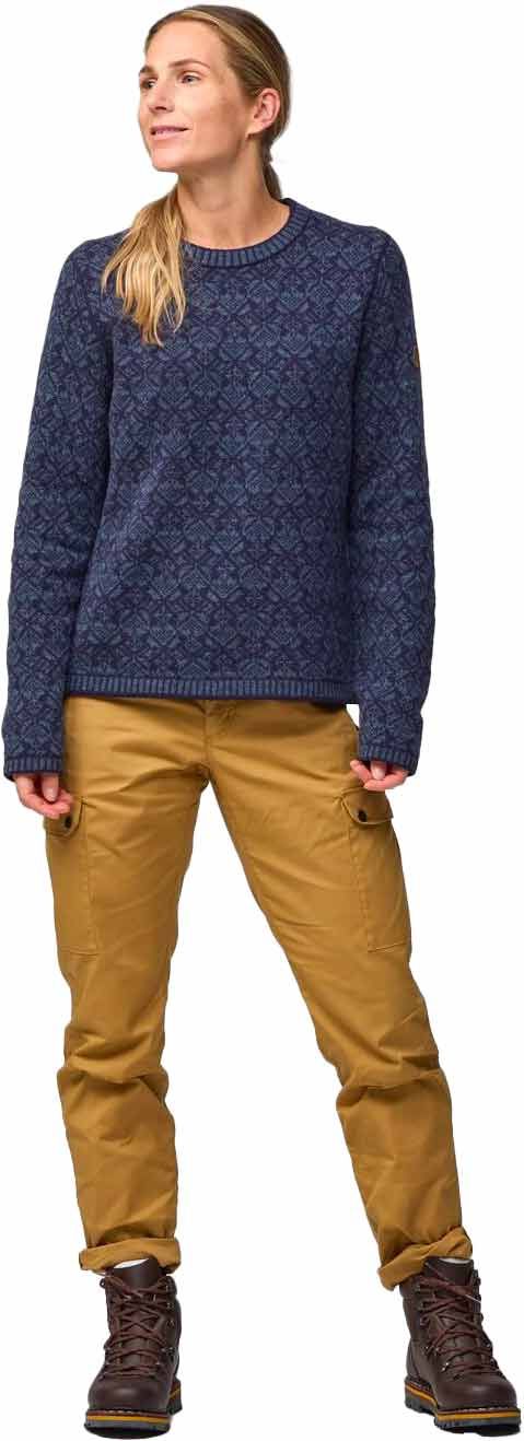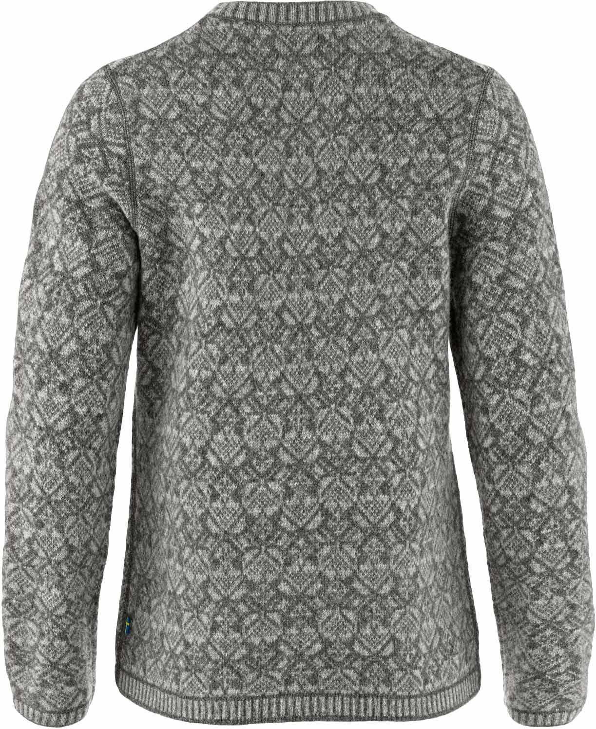 Pull femme Snow Round Neck Sweater Grey Fjällräven en laine d’agneau 100 % traçable : isolation naturelle, motif jacquard folklorique, finitions côtelées et logo renard en cuir.