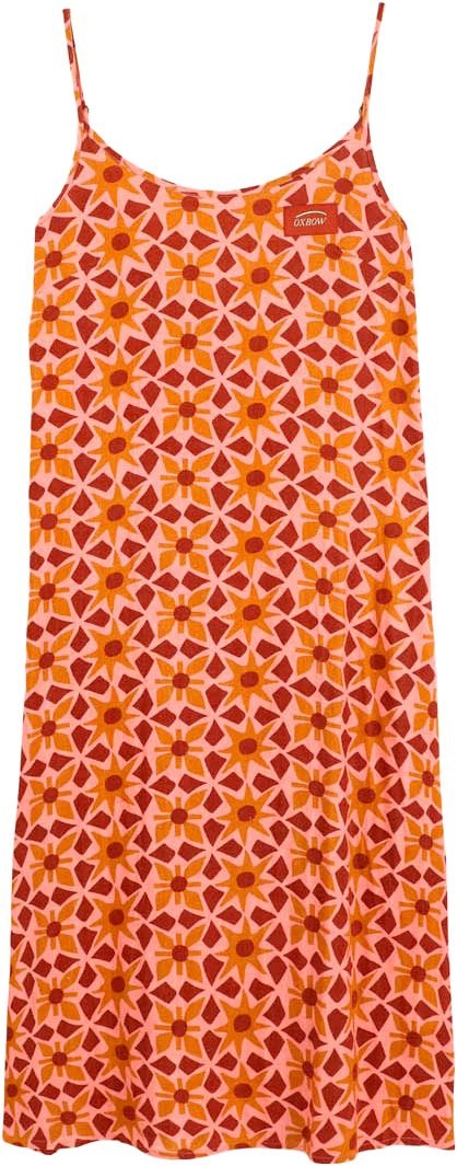Robe Oxbow Azulejo Dress Red Island à fines bretelles pour femme, en mélange rayonne et lin léger à imprimé vintage, idéale pour l’été à la plage ou en terrasse avec style et confort.