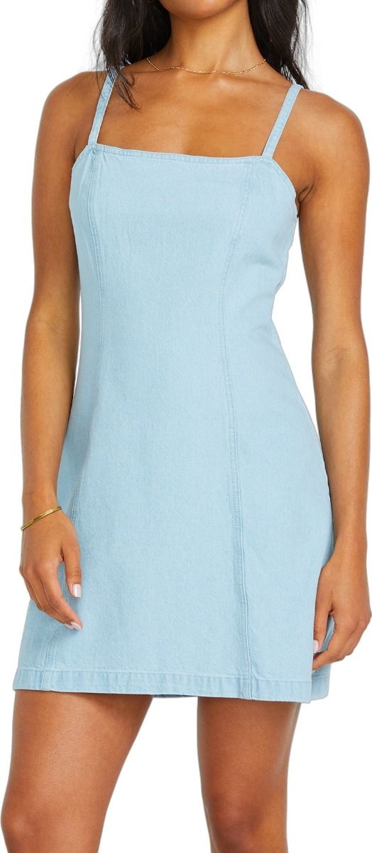 Robe Stay In The Sun Denim Dress Salt Blue en 100% coton, coupe fluide près du corps, décolleté droit minimaliste, fermeture zippée dos, longueur standard, médaillon métallique discret.