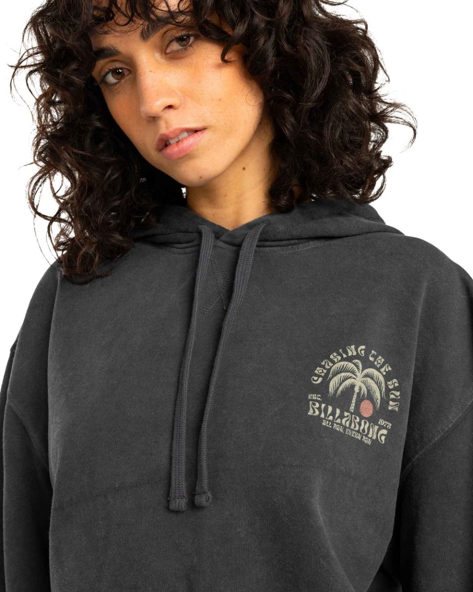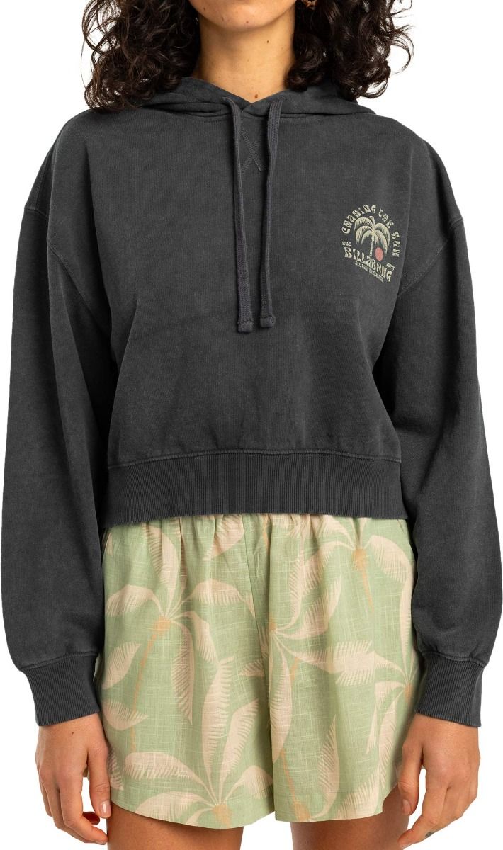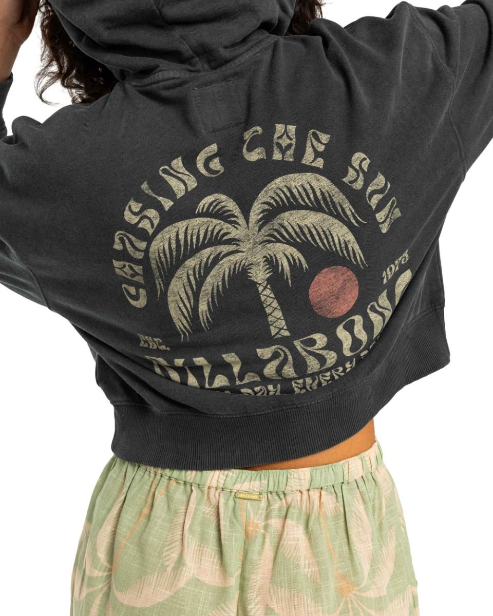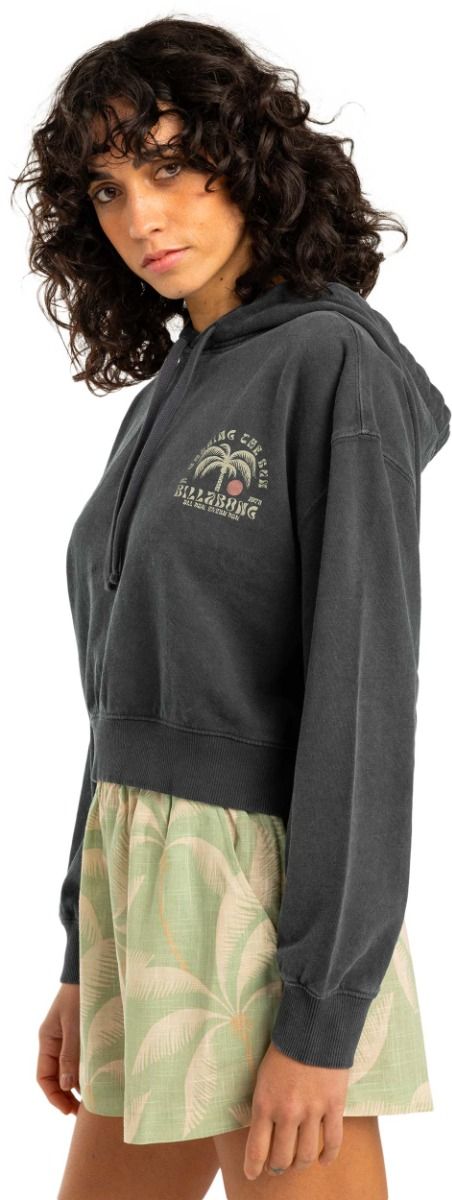 Le sweat à capuche Billabong All Day Sun Hoodie Off Black allie coton recyclé et polyester recyclé dans une coupe courte moderne; poignets et ourlet côtelés assurent tenue et liberté, imprimés graphiques avant/arrière complètent le style éco-responsable.