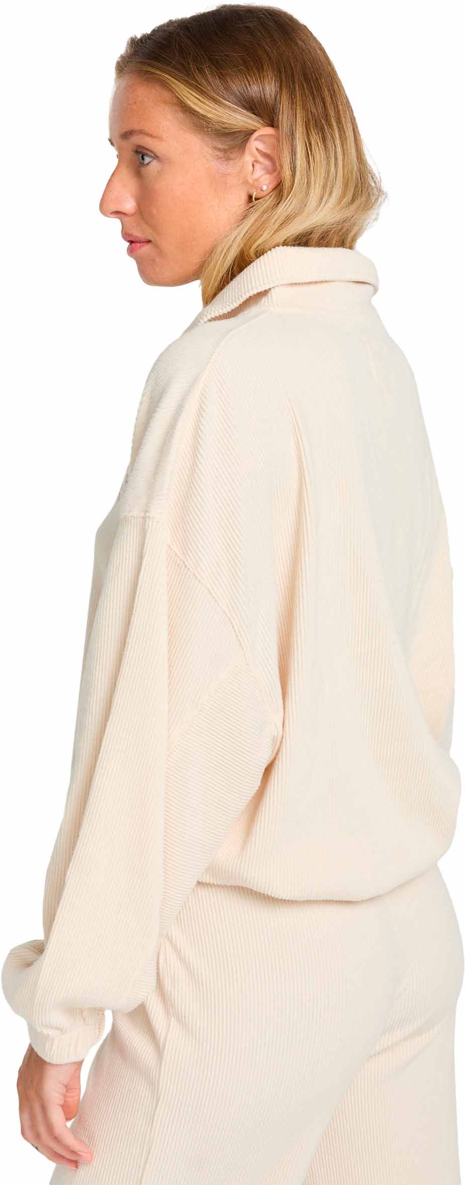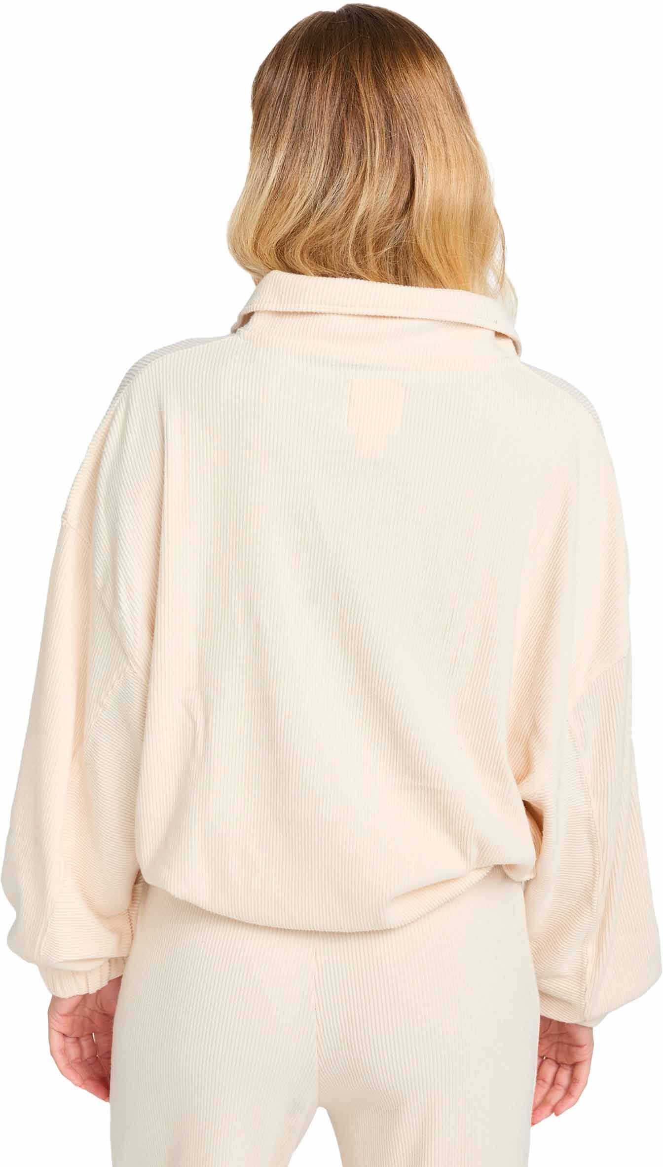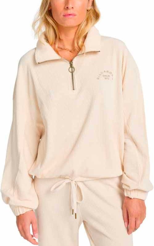 Sweat Billabong Coffee Time White Cap femme en velours côtelé polyester stretch, demi-zip et ourlet réglable pour un confort décontracté.