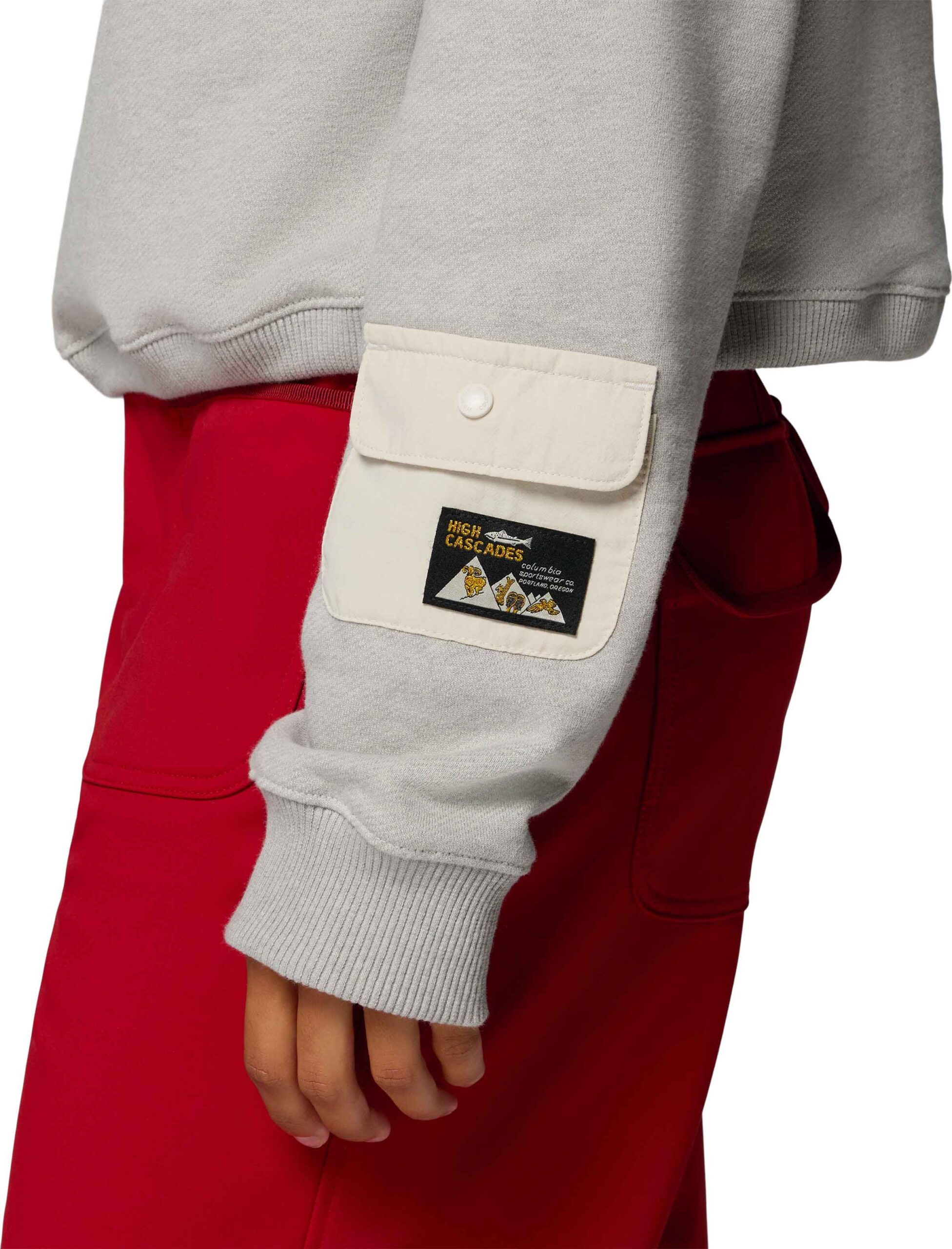 Columbia High Cascades Crop French Terry LS Dark Stone : sweat court femme en coton doux, coupe ajustable par cordon, poche fonctionnelle à la manche, bords-côtes pour un fit stable et respirabilité naturelle.