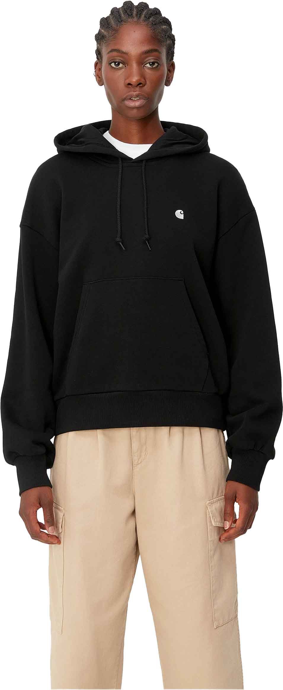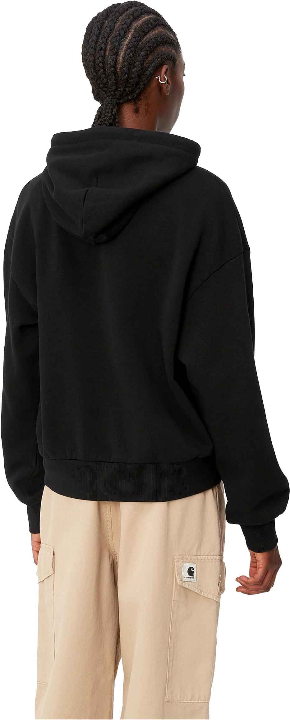 Carhartt WIP Hooded Casey Sweatshirt femme en coton noir/argent, coupe ample avec capuche réglable, poignets côtelés et poche kangourou pour un confort doux au quotidien.