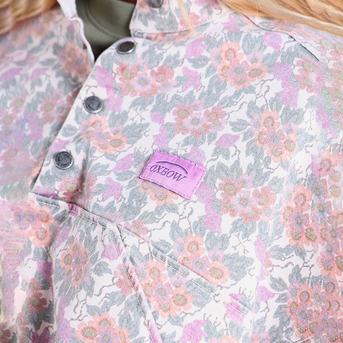 Sweat Oxbow Printed Twill Sweater Jacket femme en coton multicolore, imprimé floral, col demi-boutonné et grandes poches latérales pour un style affirmé et un confort adapté aux journées fraîches.