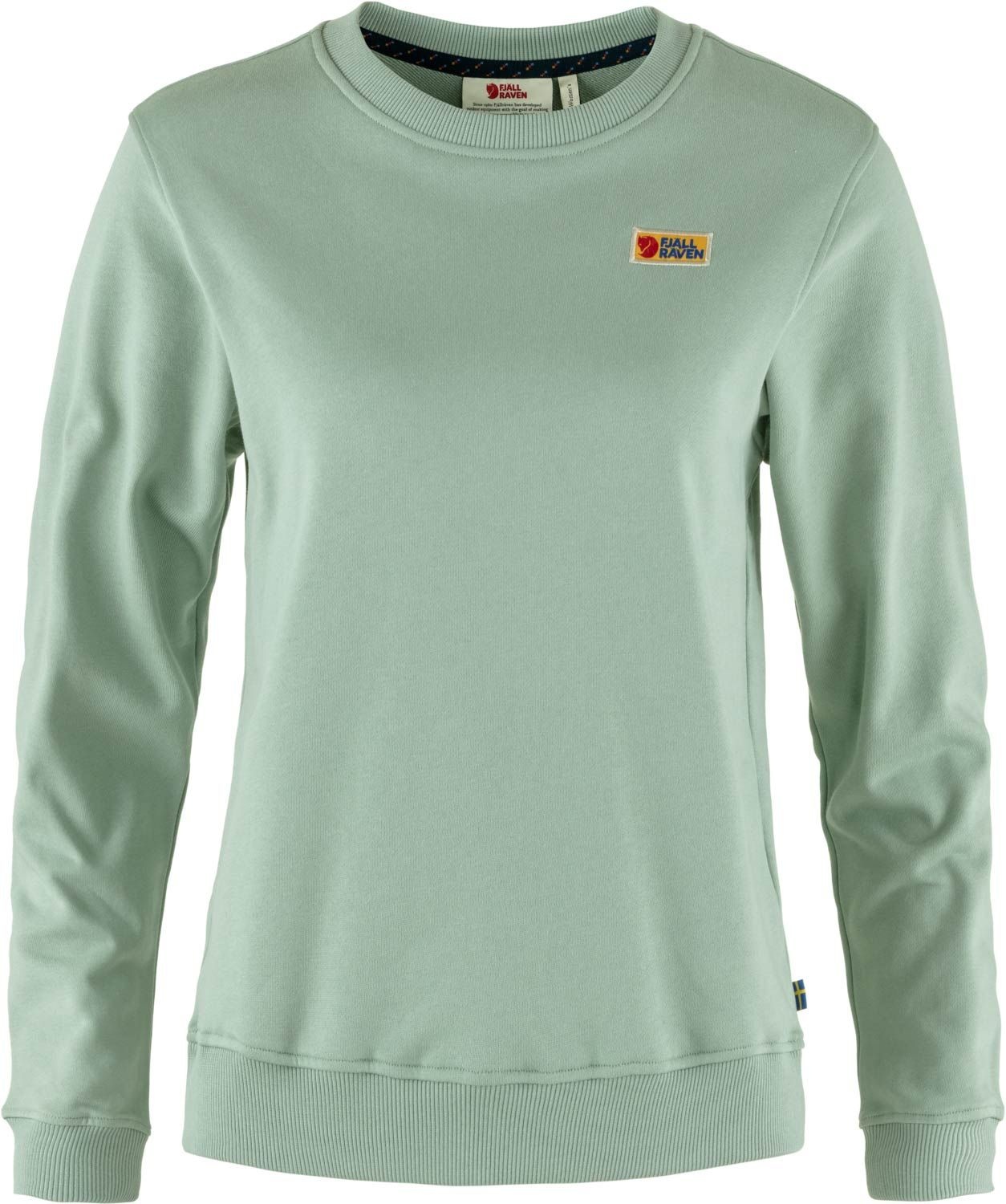 Le sweat Fjällräven Vardag Sweater Misty Green pour femme, en coton organique, allie confort doux et style intemporel au logo rétro des années 70 pour vos sorties quotidiennes.