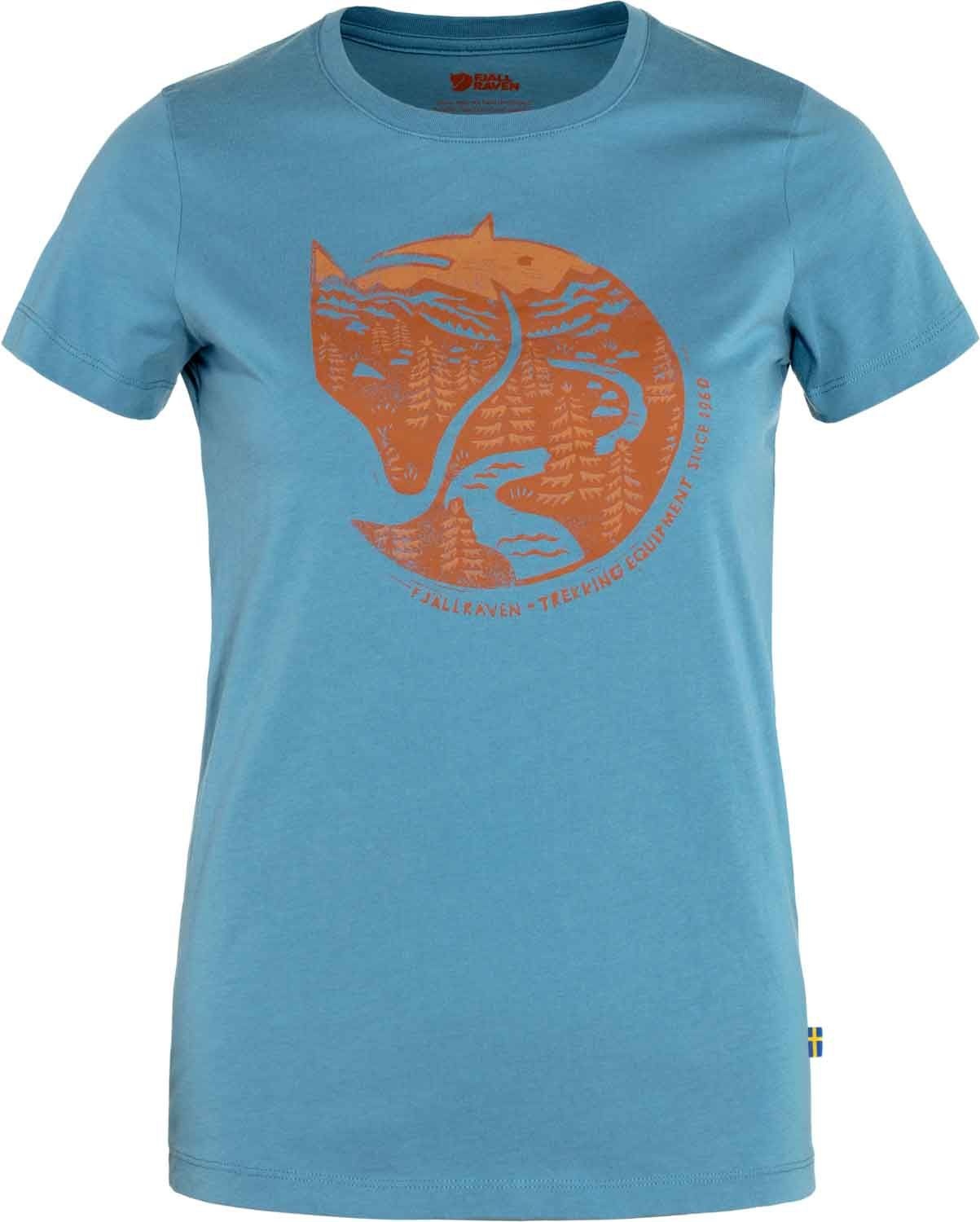 T-shirt Fjällräven Arctic Fox Dawn Blue femme en coton biologique, col rond et manches courtes. Motif imprimé original pour balades urbaines ou sorties nature.