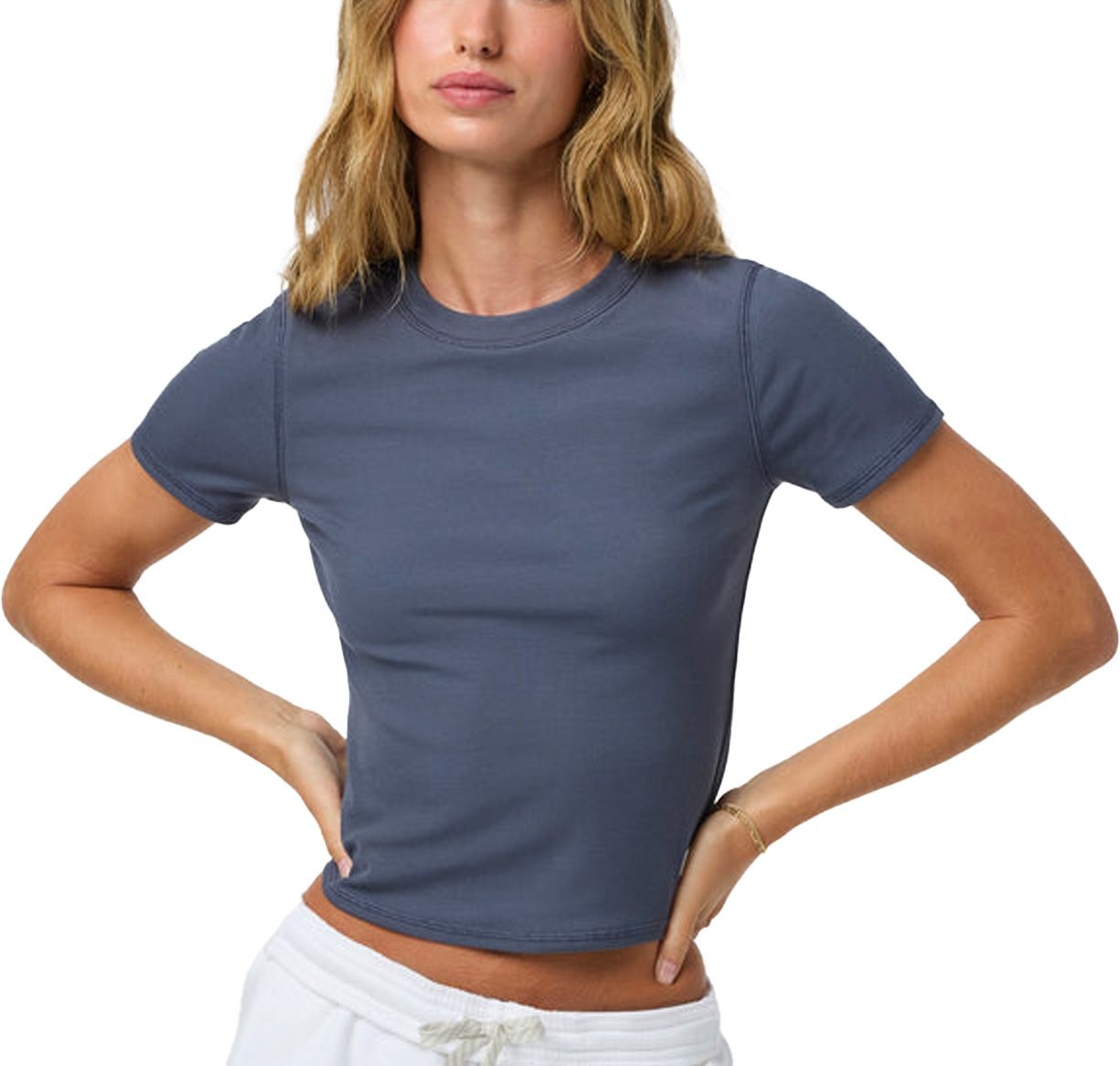 Le Pose Fitted Tee Azure est un t-shirt ajusté femme en modal haut de gamme, doux, extensible et durable, qui épouse la silhouette avec liberté de mouvement grâce à son tricot côtelé stretch. Coupe courte et col ras du cou pour un style polyvalent, moderne et intemporel.