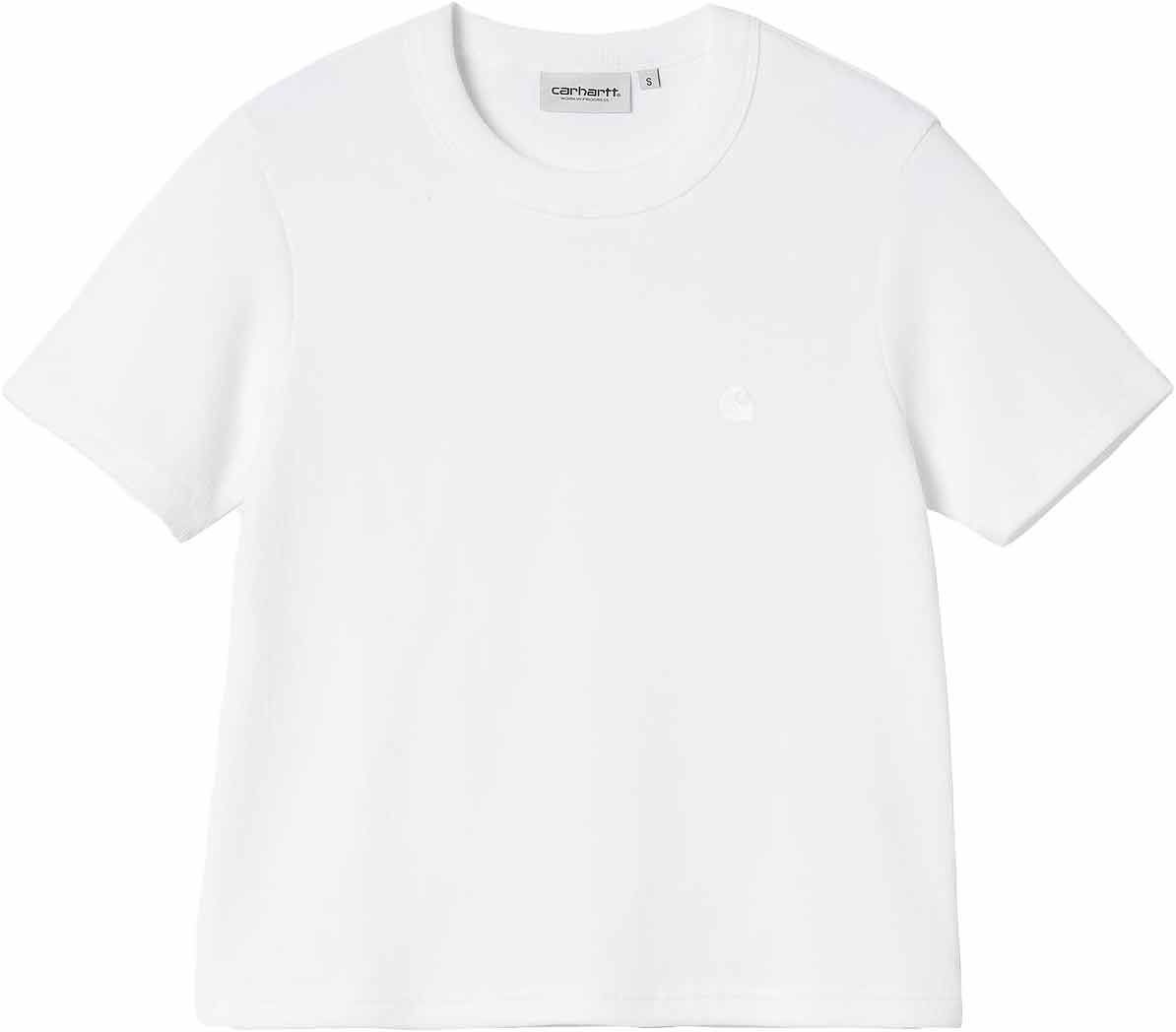 Carhartt WIP S/S Phillipa T-Shirt White pour femme, coupe ajustée en coton côtelé avec broderie discrète. Associe facilement chino ou jean pour un style quotidien élégant.