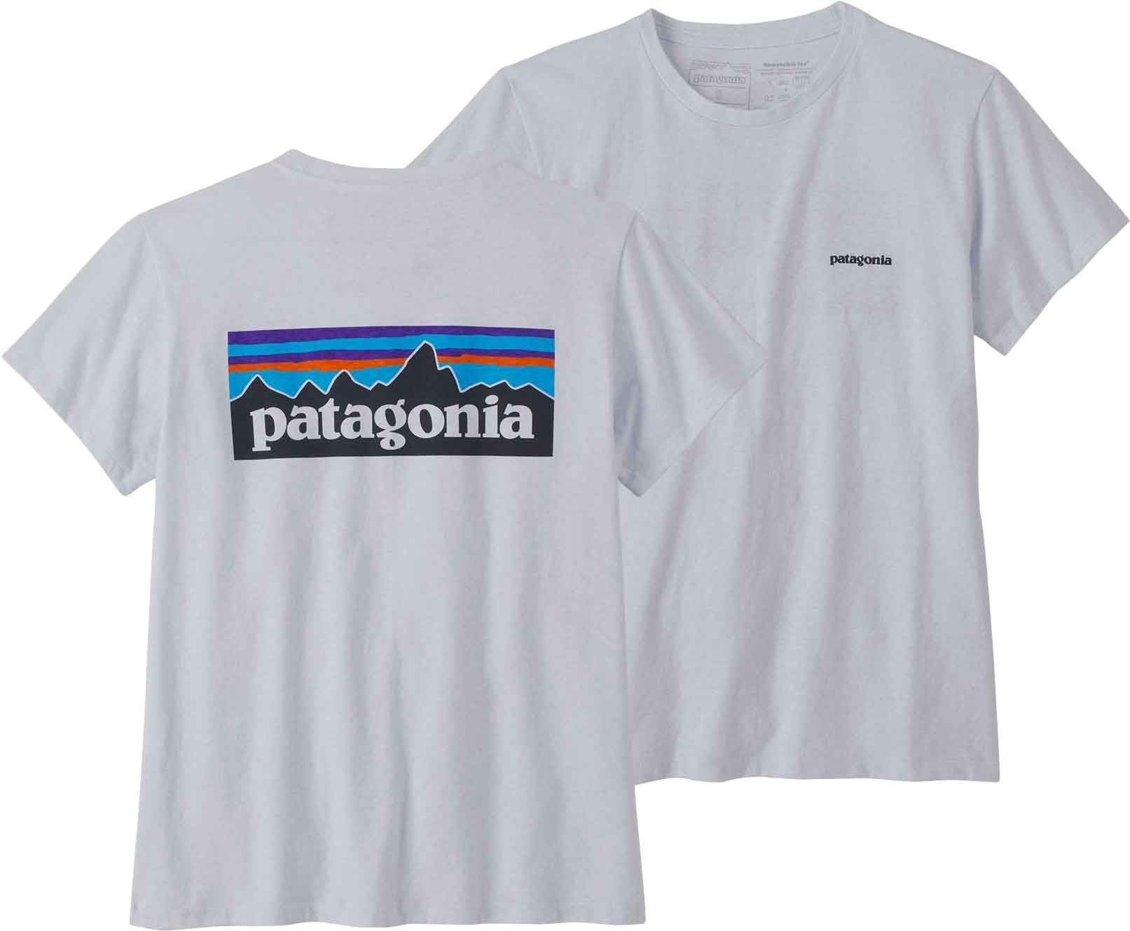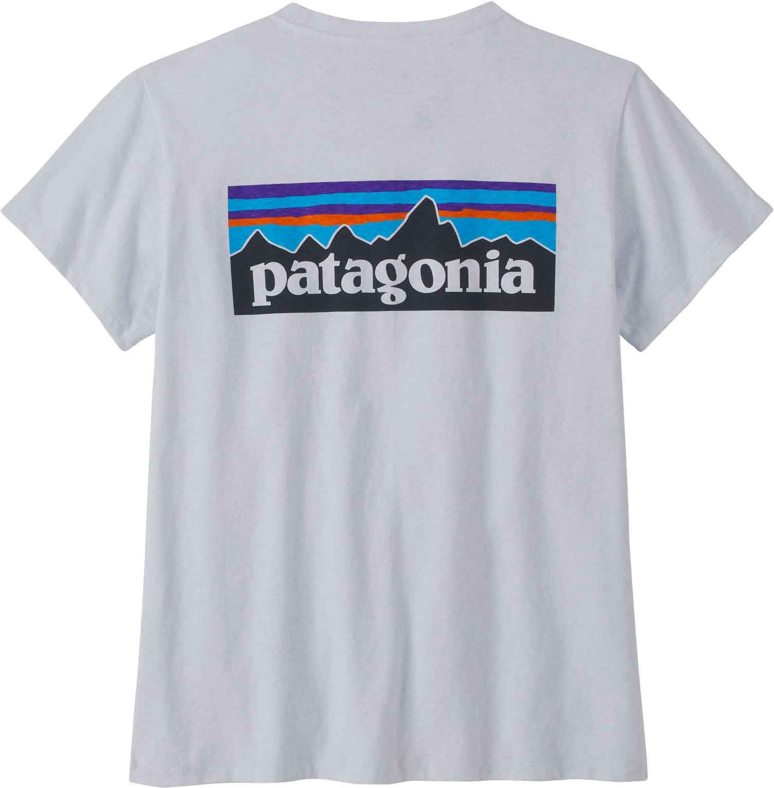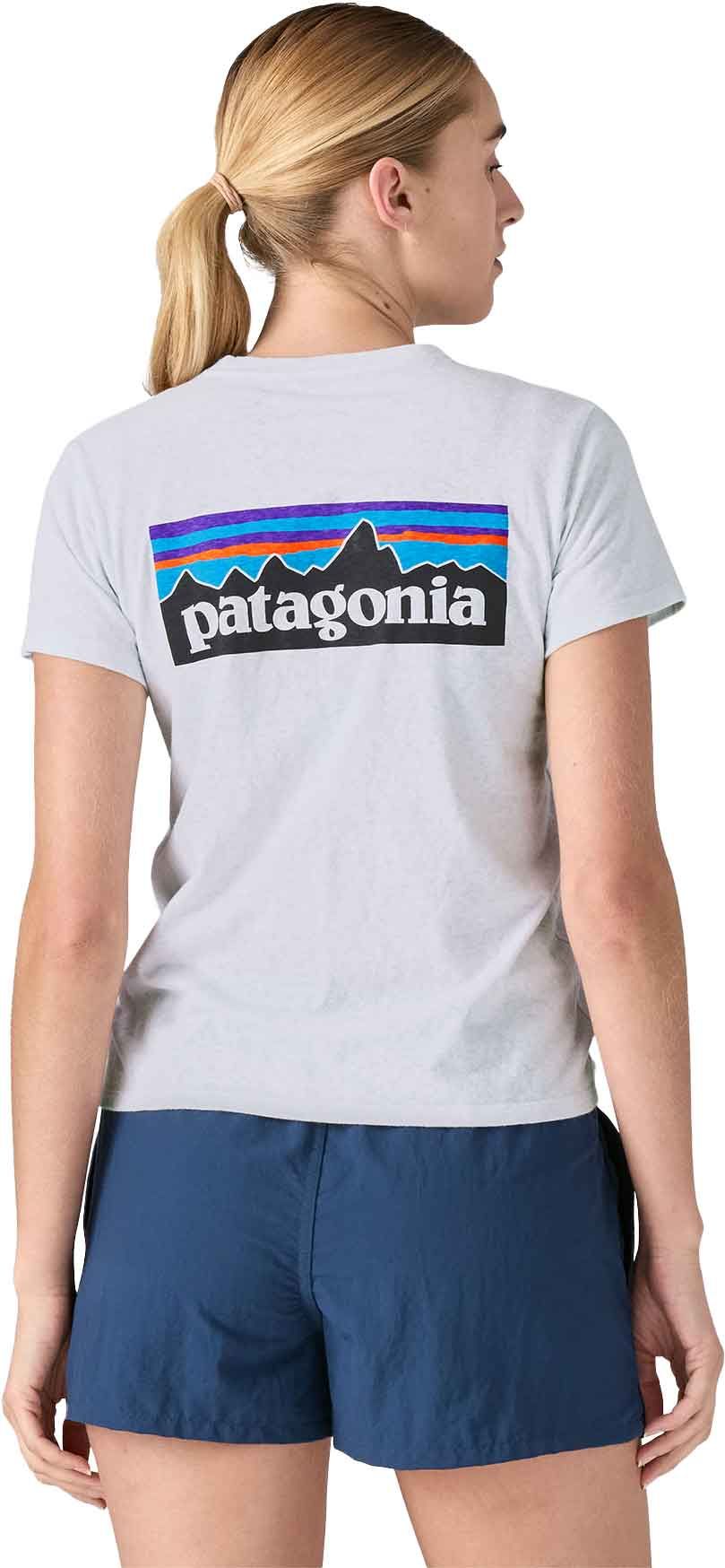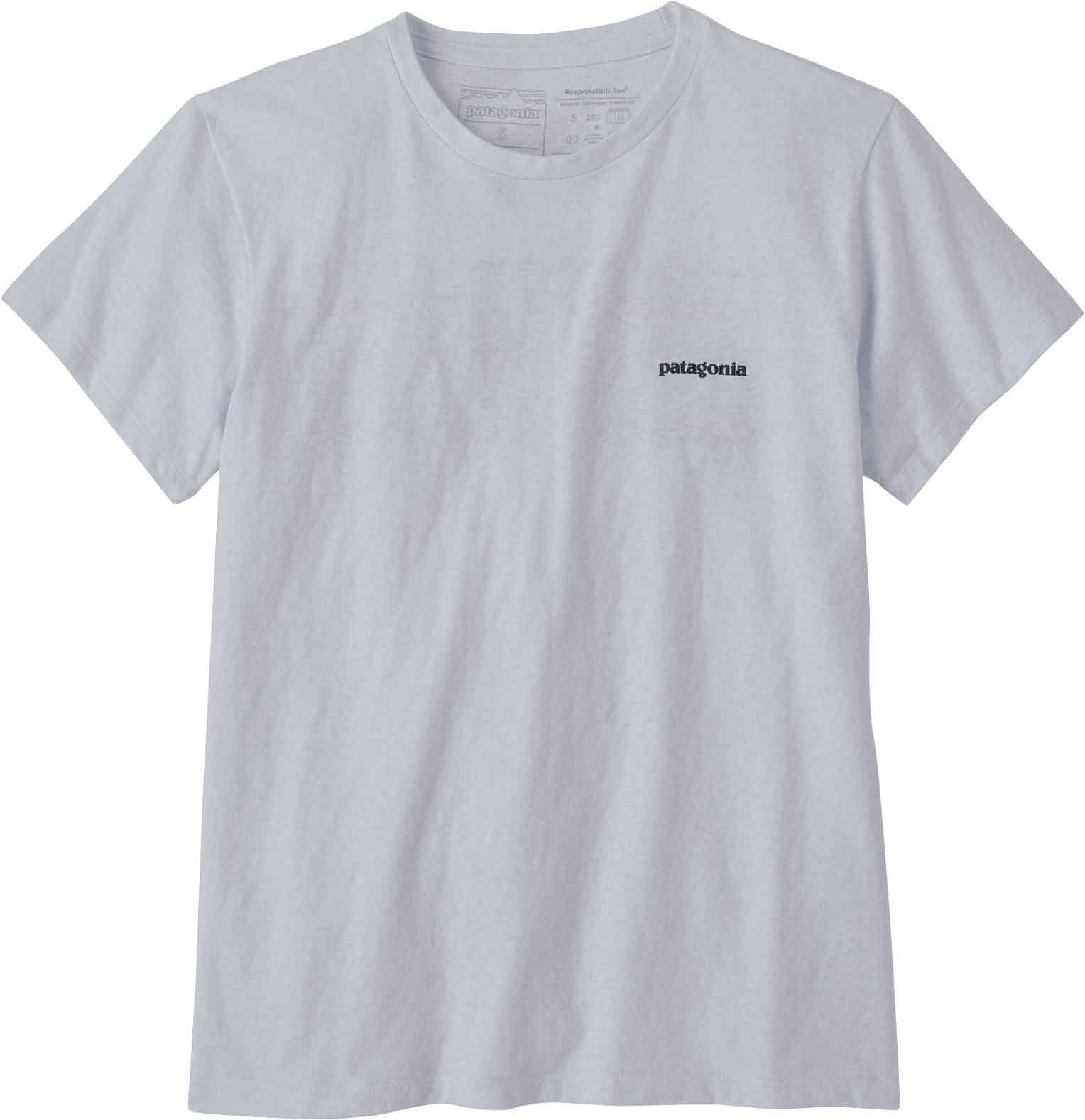 T-shirt Patagonia P-6 Logo Responsibili-Tee White femme en coton recyclé, réduisant l’eau de 96 % et les émissions de CO₂ de 45 %. Confort quotidien toute saison, composé de 4,8 bouteilles et 118 g de chutes.
