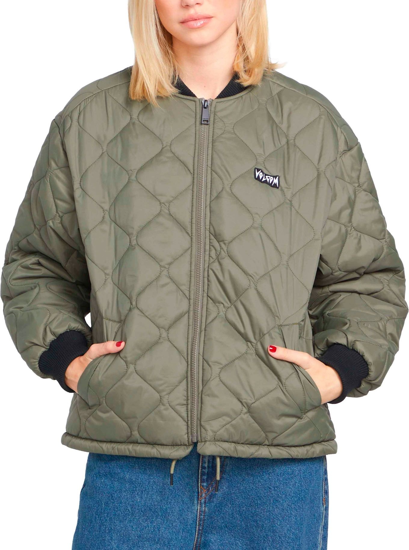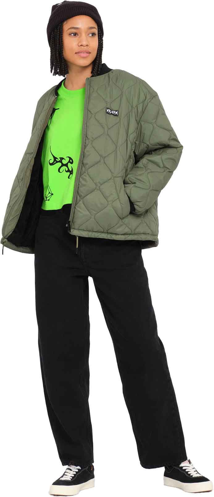 La veste Milie Jacket Wintermoss Volcom pour femme combine finition déperlante Teflon EcoElite™ sans PFC, poches passepoilées et zip central pour un style fonctionnel face aux intempéries.