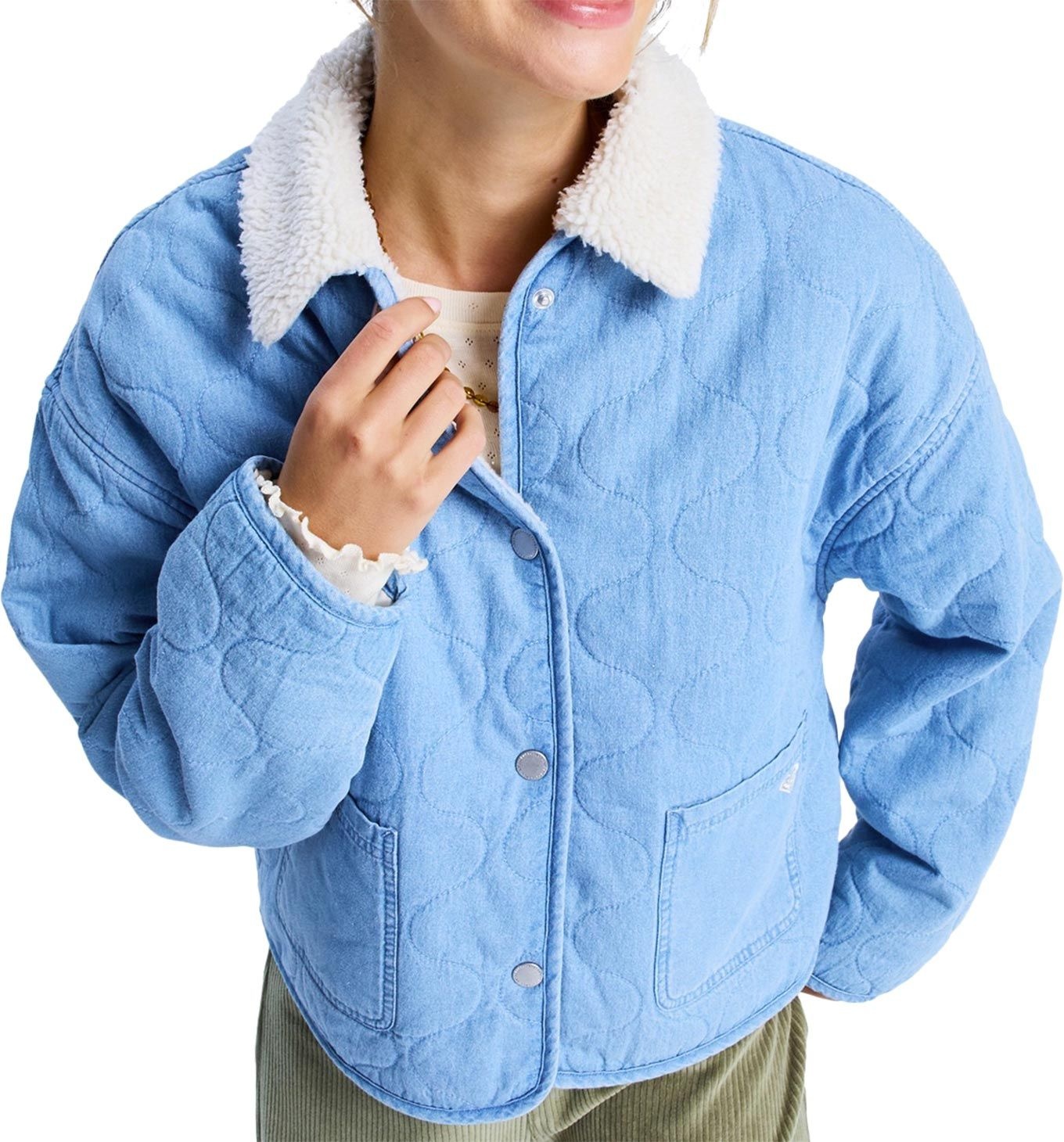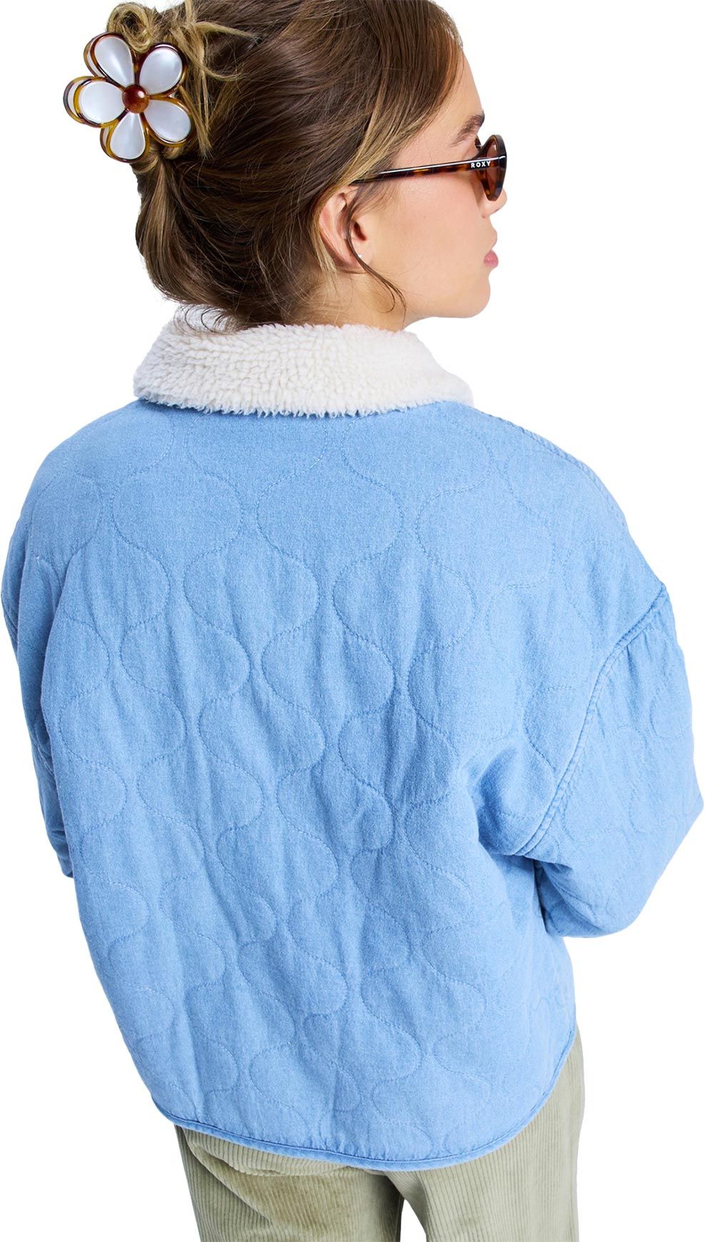 Veste en jean Roxy Not So Basic Beau Blue pour femme, doublée sherpa et taffetas, en denim 100% coton léger, coupe ample, finition délavée vintage, col et poches plaquées sherpa, logo brodé.