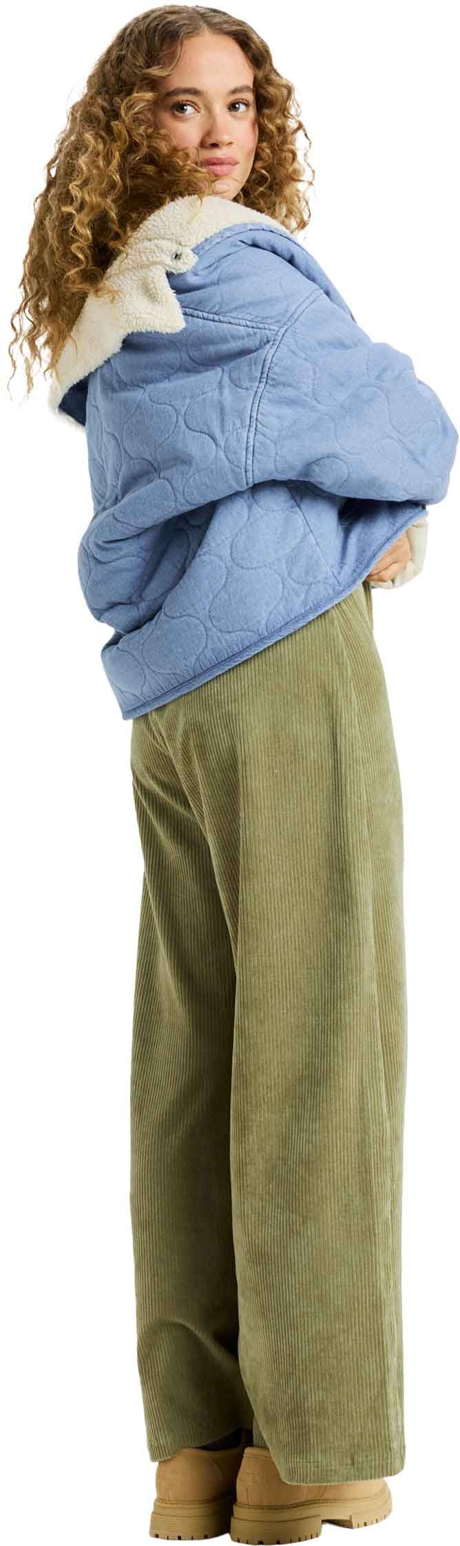 Veste en jean pour femme doublée sherpa, conçue pour un style décontracté et chaleureux. Tissu denim léger 100 % coton, robuste et doux au toucher. Doublure corps en polaire sherpa pour une chaleur enveloppante ; manches doublées taffetas. Aspect matelassé et rembourré inspiré des vestes rétro. Coupe ample permettant le superposition avec d’autres couches. Poches plaquées à l’avant pour un accès pratique. Fermeture par boutons métalliques. Col entièrement doublé sherpa renforçant le confort thermique. Délavage vintage offrant une finition usée et authentique. Logo Roxy brodé sur une poche.