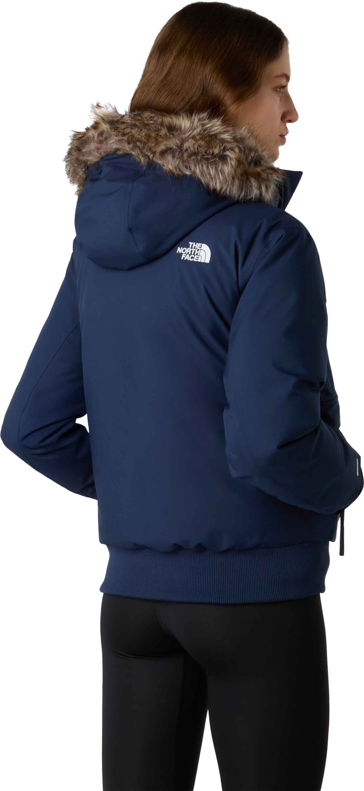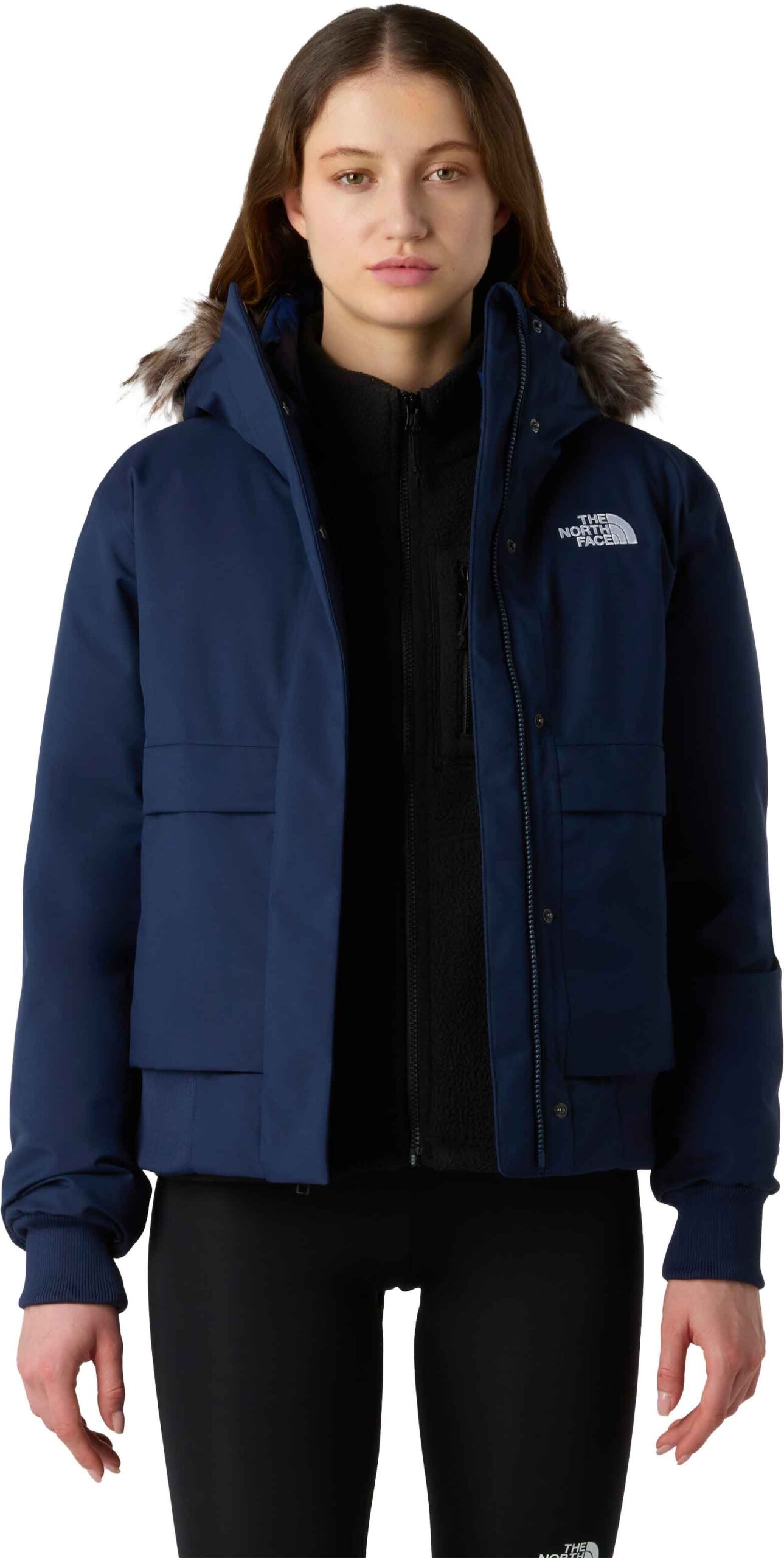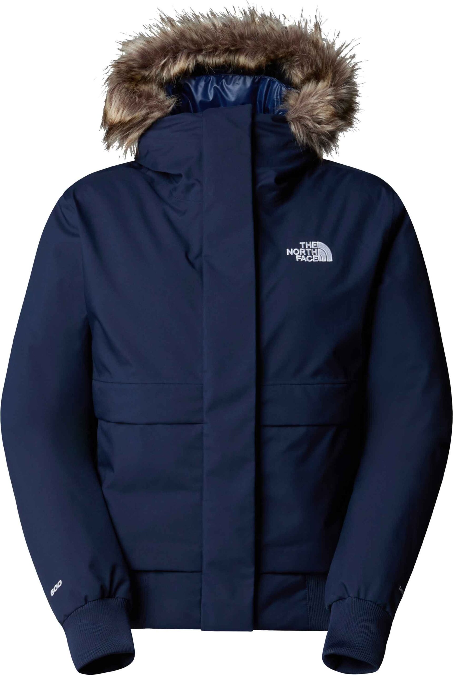 The North Face Arctic Bomber Summit Navy, veste hiver femme en DryVent™ 2L imperméable, respirante et coupe-vent, isolée de duvet recyclé pour une chaleur légère, capuche ajustable fausse fourrure, poches chauffe-mains, polyester recyclé.