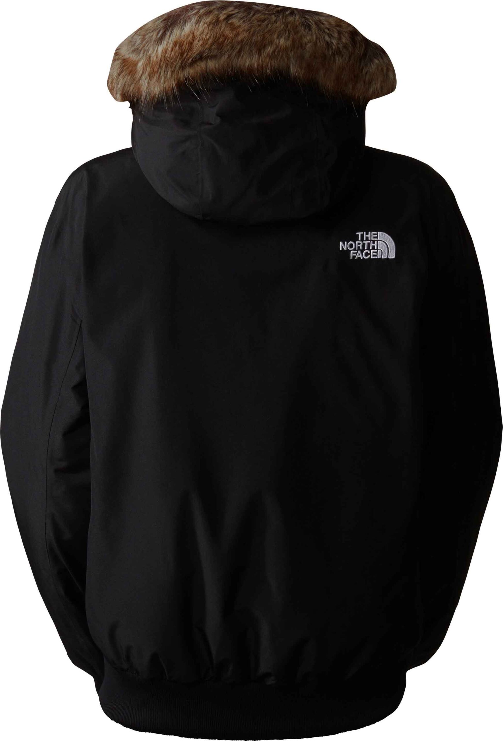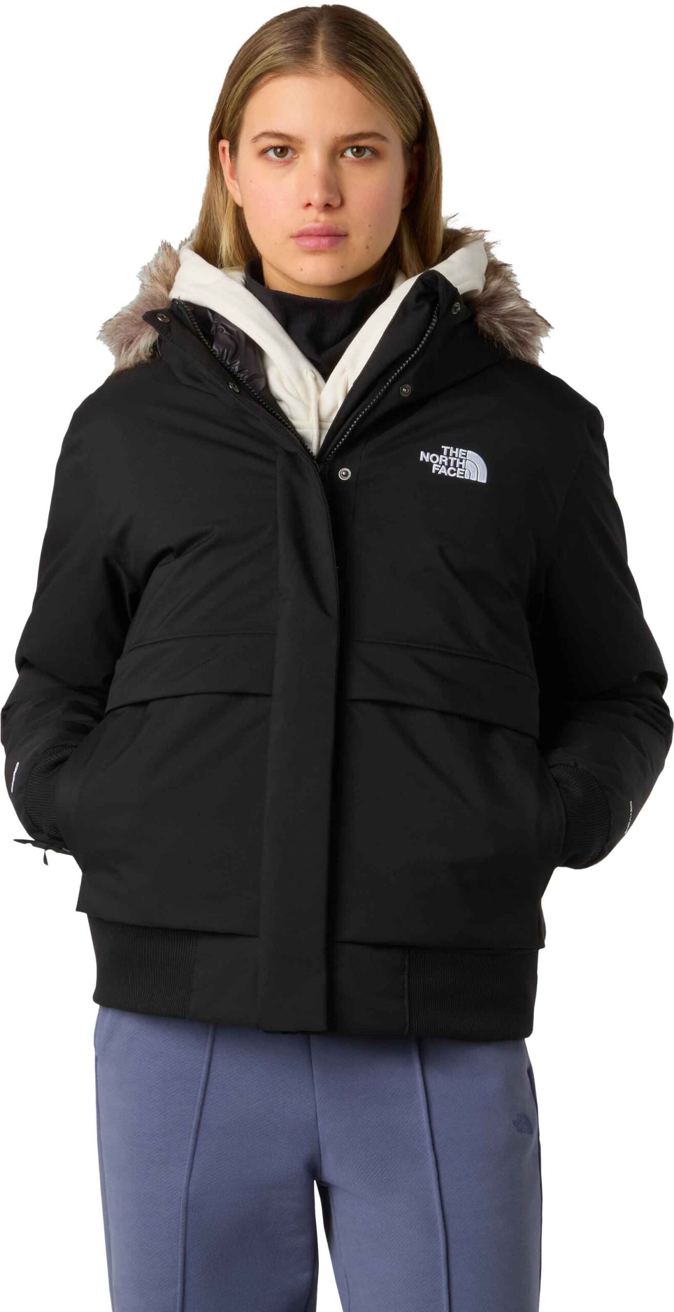La veste Arctic Bomber TNF Black de The North Face associe coquille DryVent™ 2L imperméable et respirante, isolation en duvet recyclé et capuche bordée de fausse fourrure pour chaleur et style urbain par temps froid.
