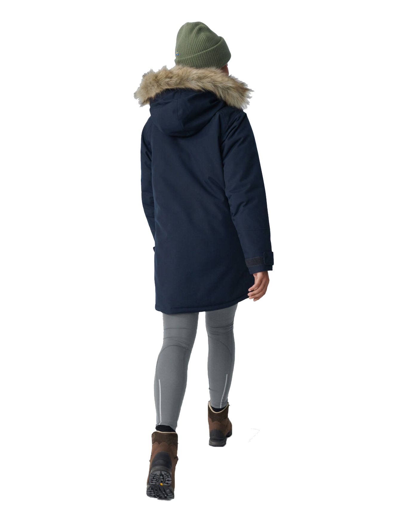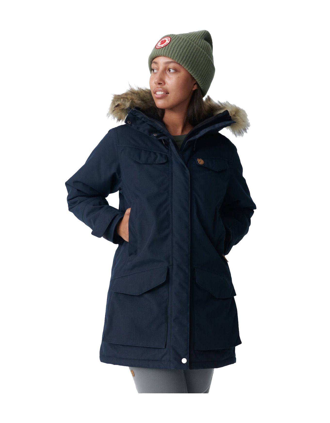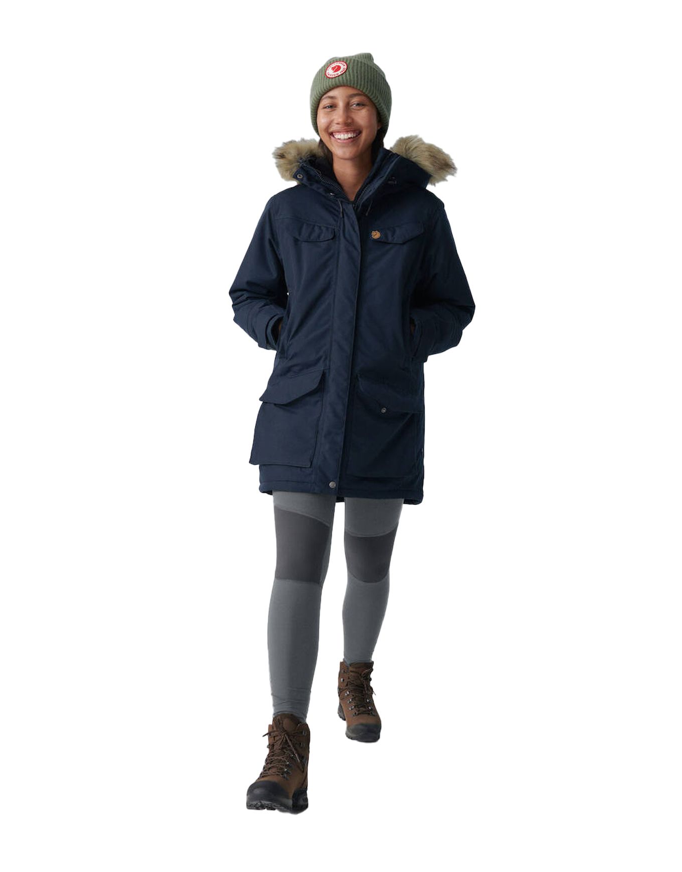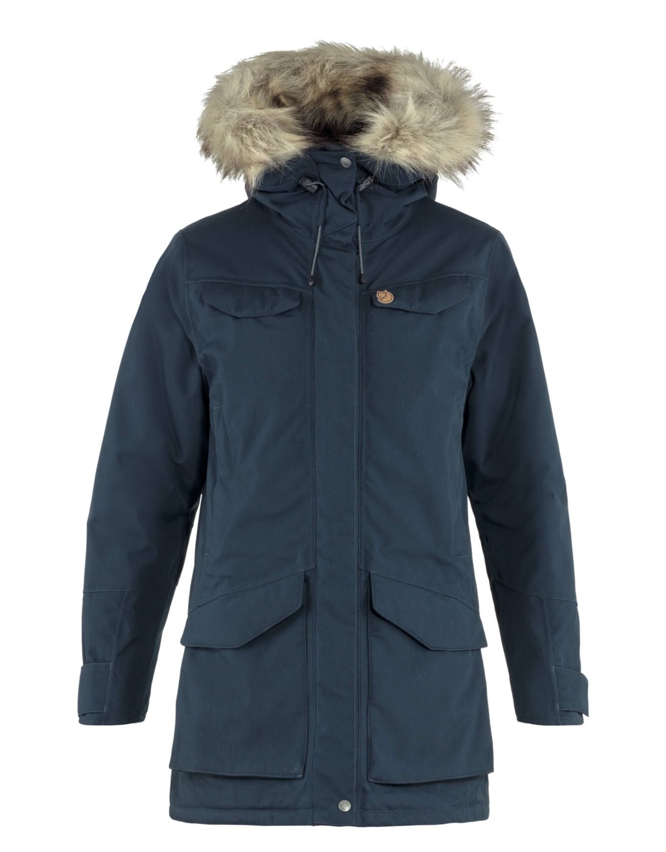 Parka Fjällräven Nuuk femme longue en Dark Navy, imperméable et respirante membrane Hydratic®, isolée Supreme Microloft pour une chaleur fiable l’hiver, capuche doublée polaire et fausse fourrure amovible, poches multiples. Coupe ample.