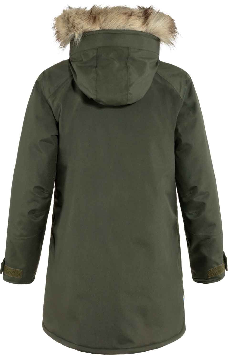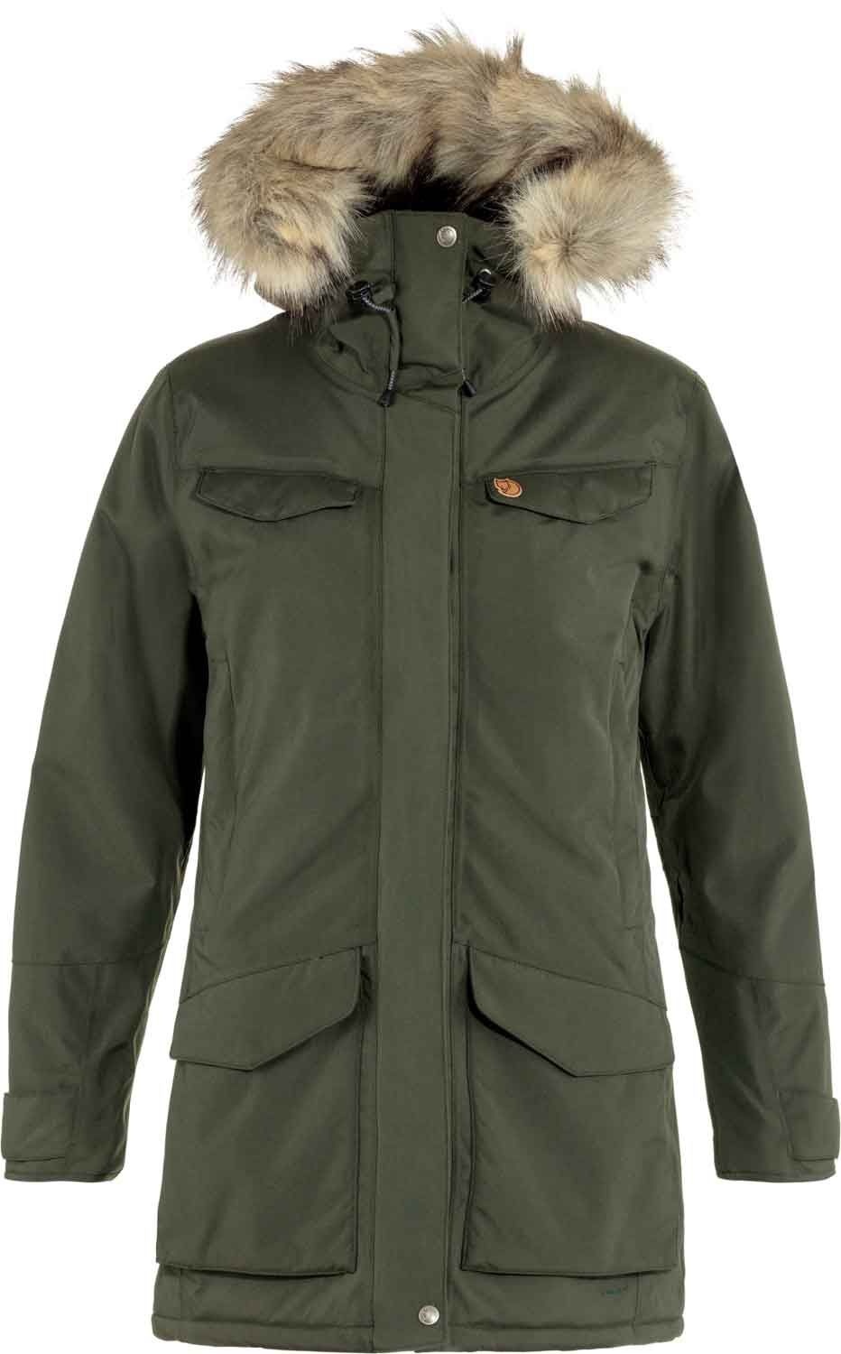Parka Fjällräven Nuuk Deep Forest femme : coupe longue, membrane Hydratic® imperméable-respirante, isolation Supreme Microloft, capuche doublée polaire et fausse fourrure, multiples poches.