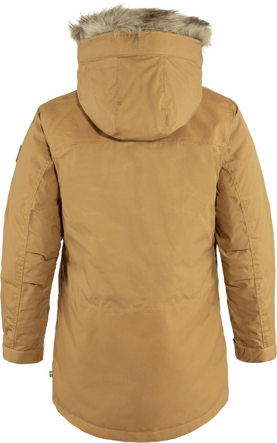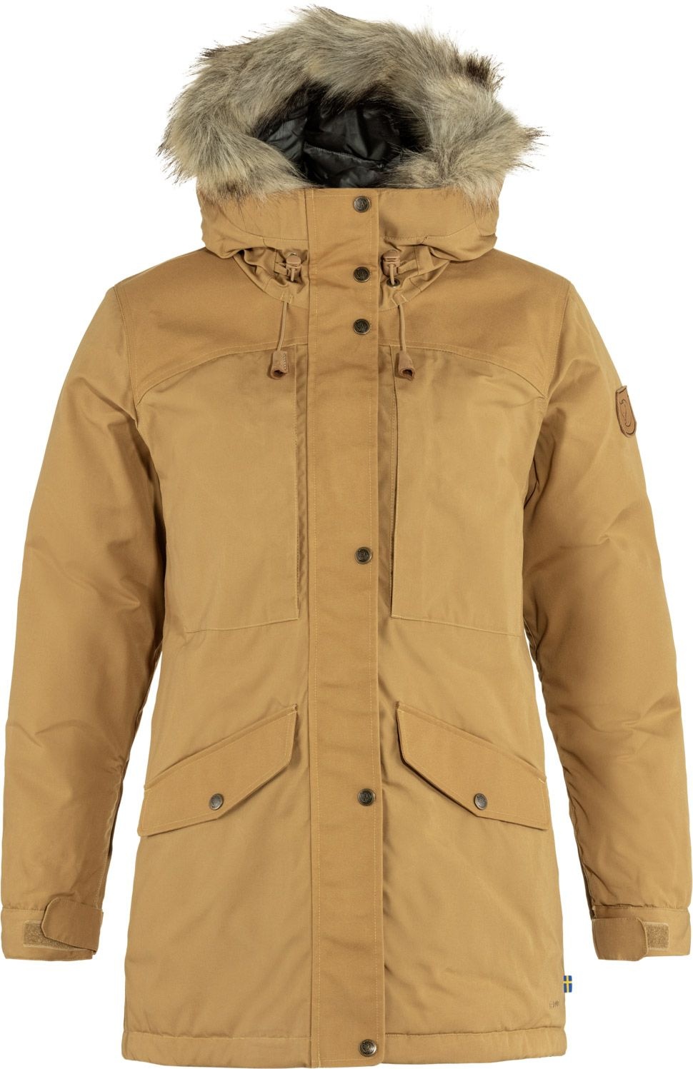 Parka Fjällräven Singi Down Buckwheat Brown femme, chaude et robuste en G-1000® Eco et duvet traçable, renforcée épaules/coudes pour l’hiver urbain intense.
