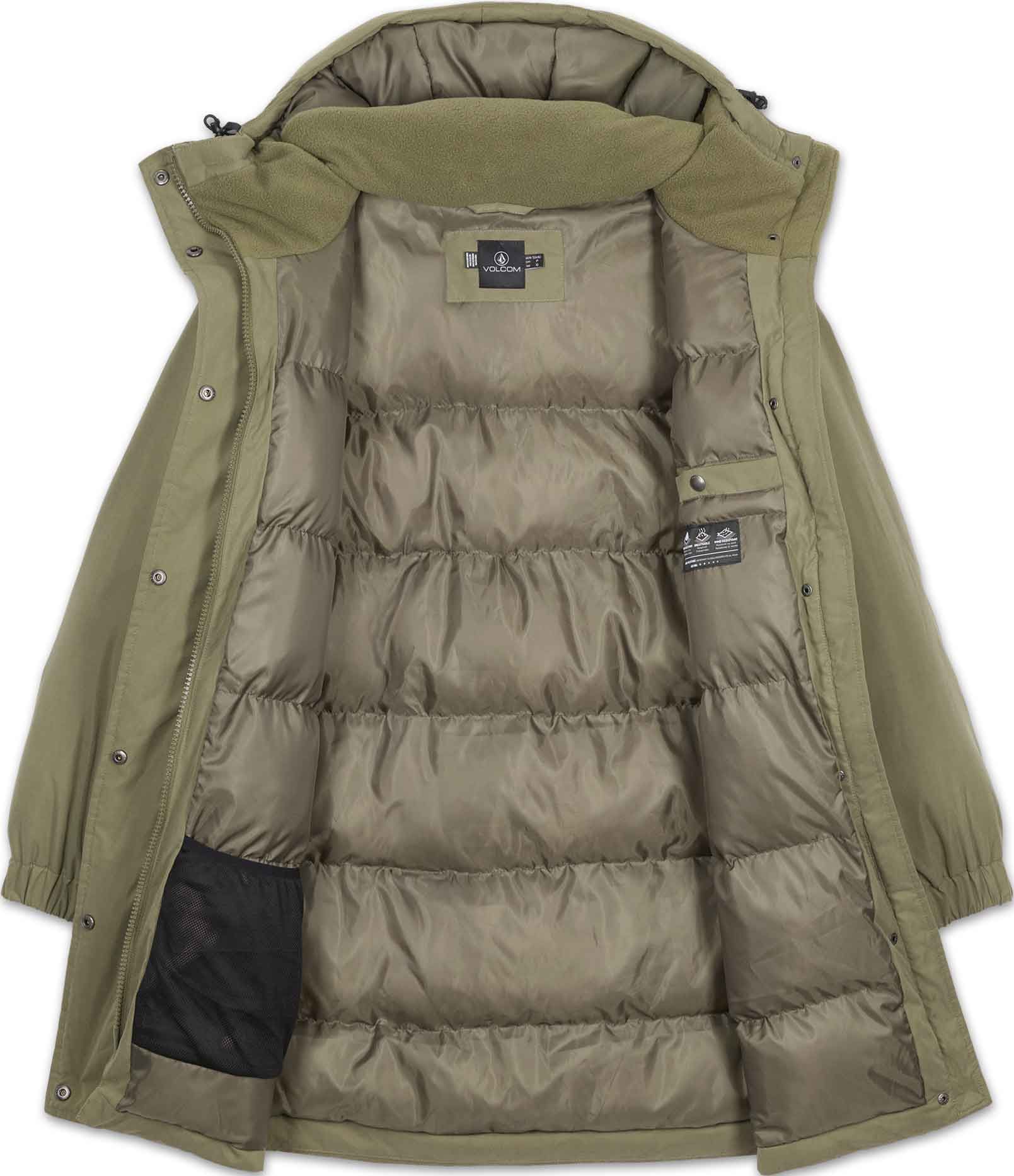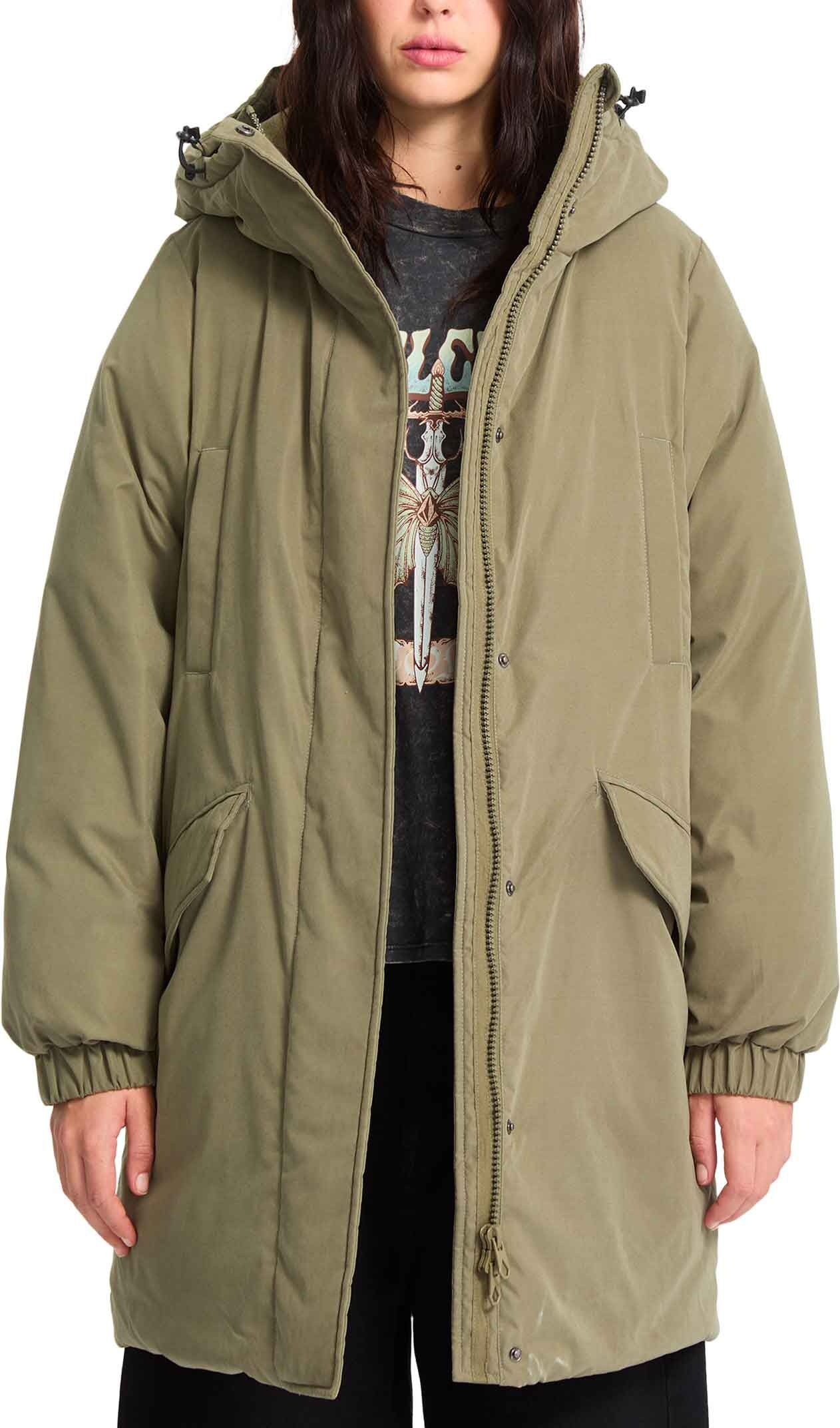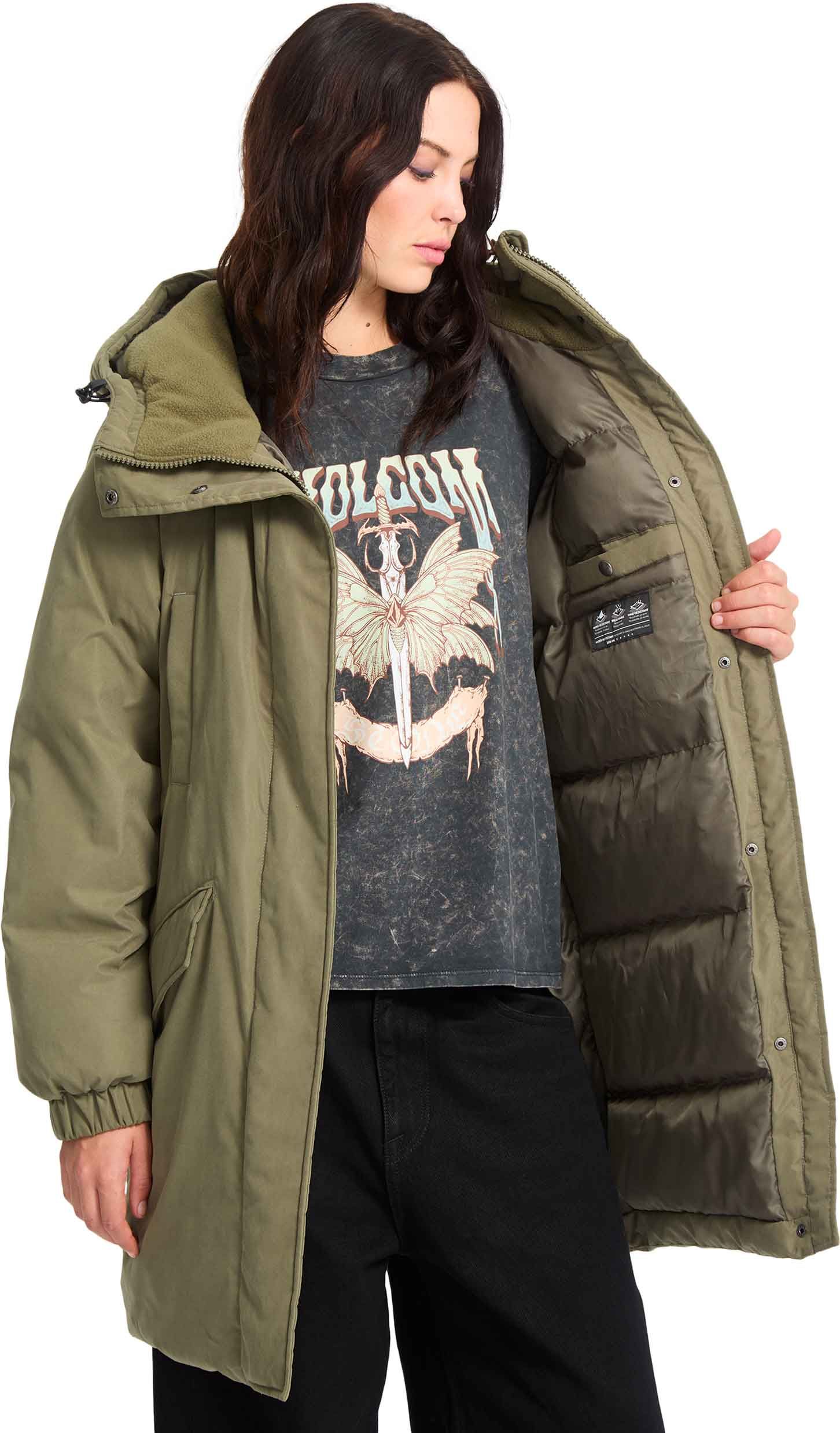 Veste Volcom Sleepi Puff Up Parka Wintermoss pour femme, chaude et déperlante Teflon EcoElite™ sans PFC, capuche fixe, coupe tendante, doublure isolante et multiples poches fonctionnelles.
