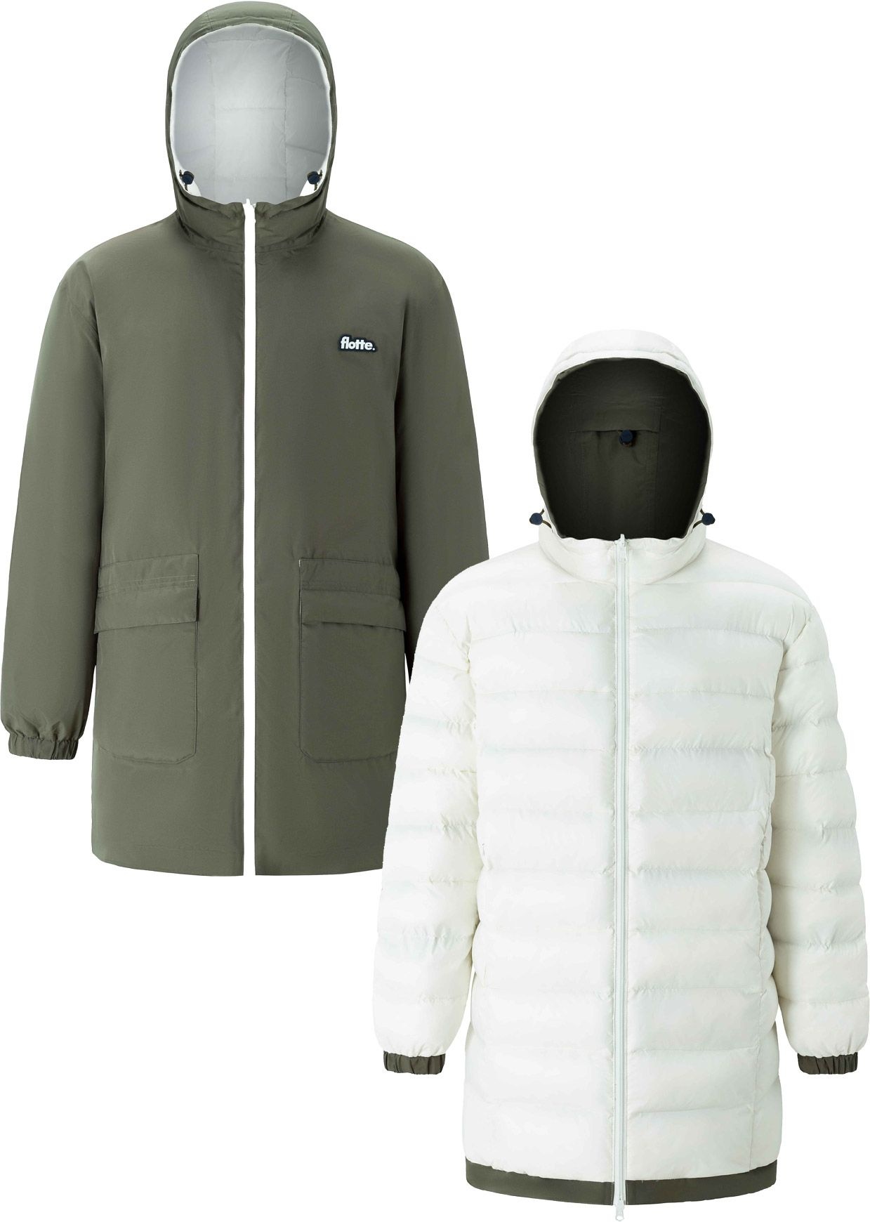 Doudoune longue Varennes Kaki/Coquille unisexe Flotte, réversible 2-en-1, imperméable, respirante et coupe-vent pour chaleur et protection en ville ou montagne.