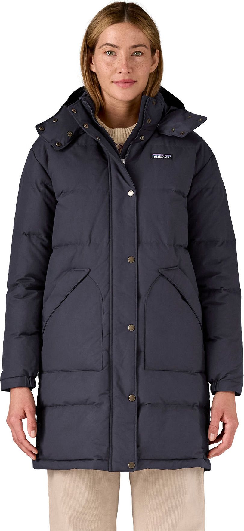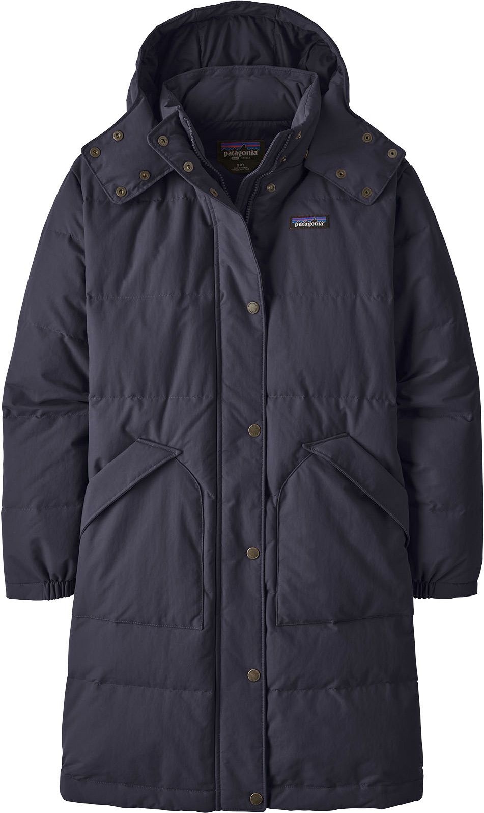 La parka Downdrift Sunken Blue femme Patagonia, en nylon NetPlus® recyclé et duvet de canard 600 CUIN, allie chaleur légère et protection hivernale avec coupe droite inspirée des années 60.